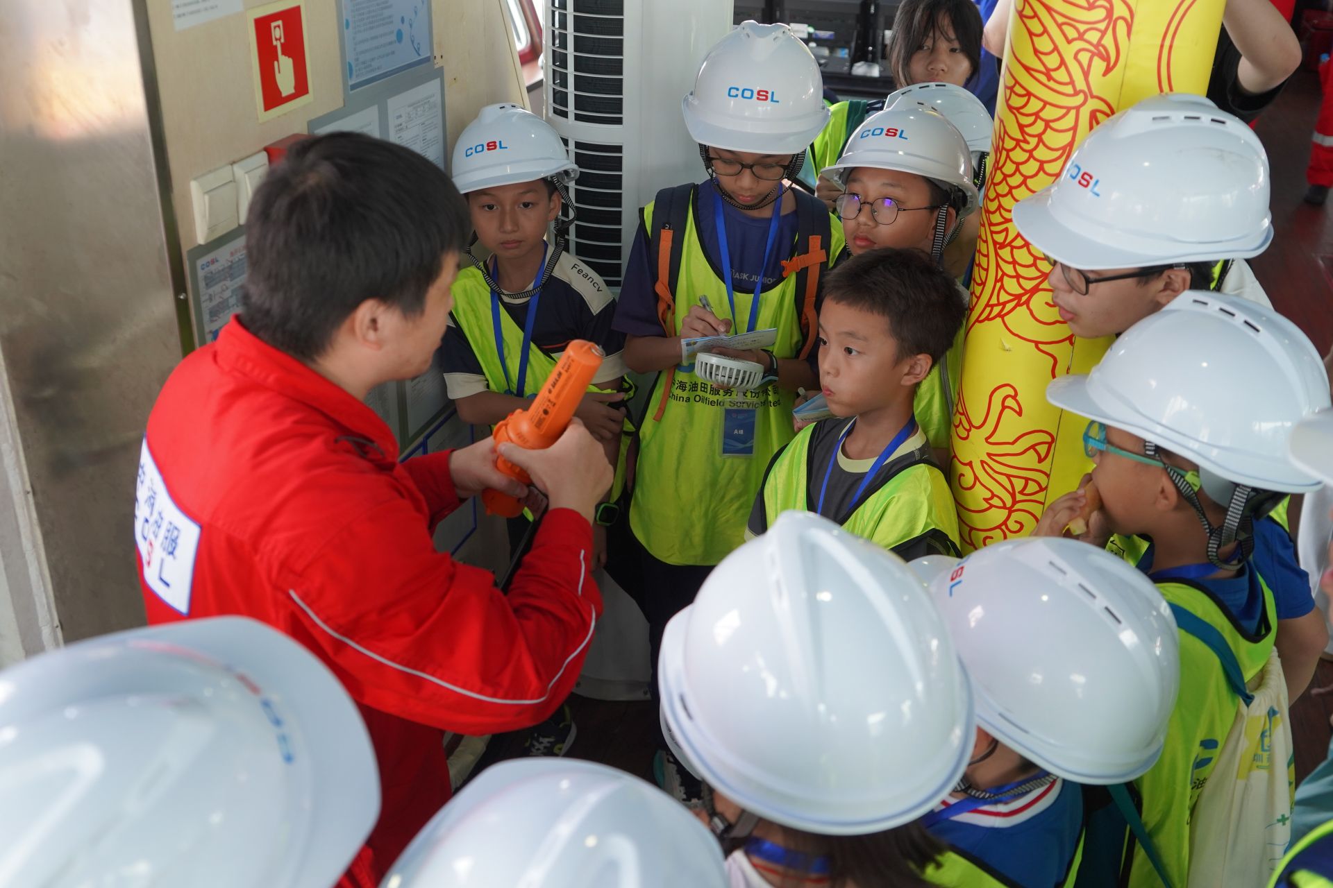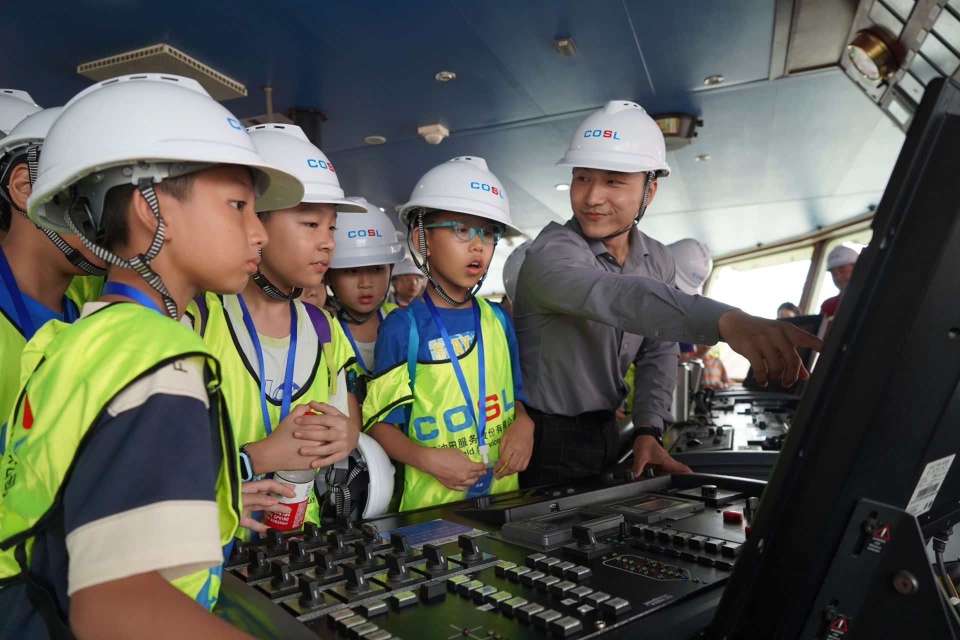 登上我国自主建造的“海洋石油691号”船探秘,从一张张海图到精密的通导设备,从船员的作业流程到船舶应对恶劣海况的“智慧大脑”,这艘集工程、运输、作业于一体的现代化船舶让孩子们驻足惊叹。“电子海图是怎么定位船只的?”“平台上真的可以停直升机吗?”孩子们与船长热烈互动,得到耐心答疑和现场演示。