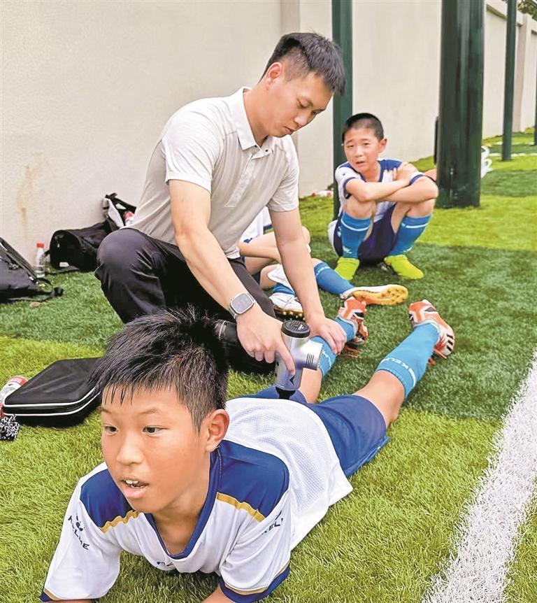 足球作为一项竞技运动,难免会有受伤的风险。要让家长从内心里支持孩子从事这项运动避免受伤焦虑,就要求整个足球教师团队的工作要做到事无巨细。体能康复教师黄锦鹏就在现场向记者展示了自己的工作日常:训练场上,女足队员陈欣(化名)争抢时摔倒在地。啪!黄老师立即举起手机拍摄伤处,却未将照片发至家长群。“我会私聊家长说明前因后果。”他展示着手机里的沟通记录——包含受伤场景描述、康复方案及训练调整建议。这种“可视化沟通”彻底化解了家长顾虑,也为第一时间给孩子进行治疗提供了依据。当陈欣母亲收到“您女儿因对抗摔倒,膝盖轻微擦伤,已冰敷处理”的专属报告时,家长回复道:“教练这么细致,我们放心。”