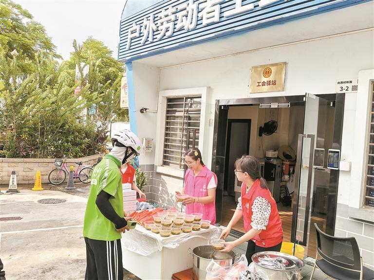 松元厦社区志愿者为骑手送上绿豆糖水。