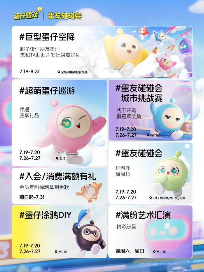 蛋友碰碰会,趣味游戏赢周边。在满纷天地西广场/7楼2号梯旁/满纷汇街区,将特别设置「蛋友碰碰会」互动区,现场可游玩套圈、投球、骰子等多样蛋仔主题趣味游戏,召集好友一起收集印章,积攒快乐能量并完成指定任务,可兑换精美周边奖励。