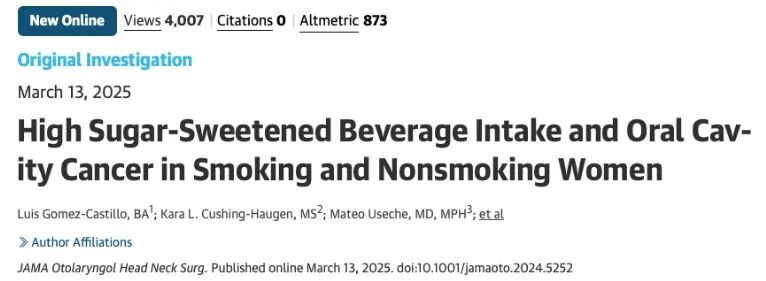 2025年3月,《美国医学会耳鼻咽喉头颈外科杂志》发表的一项研究显示,不管你抽不抽烟、喝不喝酒,多喝含糖饮料都会大大增加得口腔癌的风险。跟几乎不喝的人比起来,每天喝一杯以上甜饮料,得口腔癌的风险会高出4.87倍(一杯大概240毫升)。