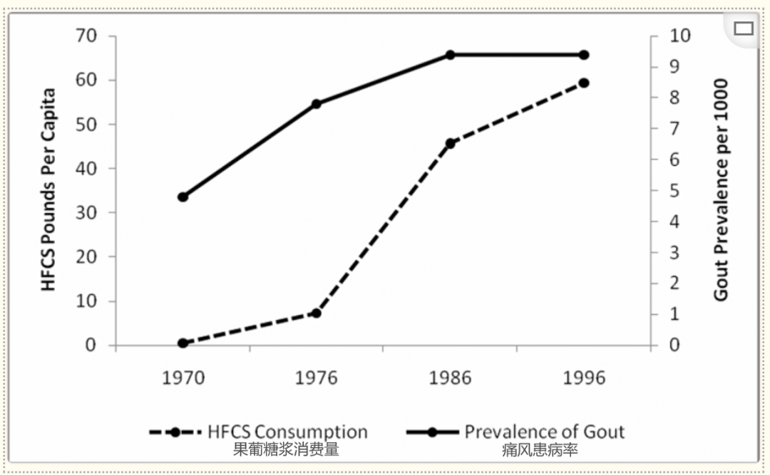自1967年引入果葡糖浆以来,美国的果糖消费量大幅增加,并且果葡糖浆的消费量与美国人痛风患病率增加的趋势相吻合。