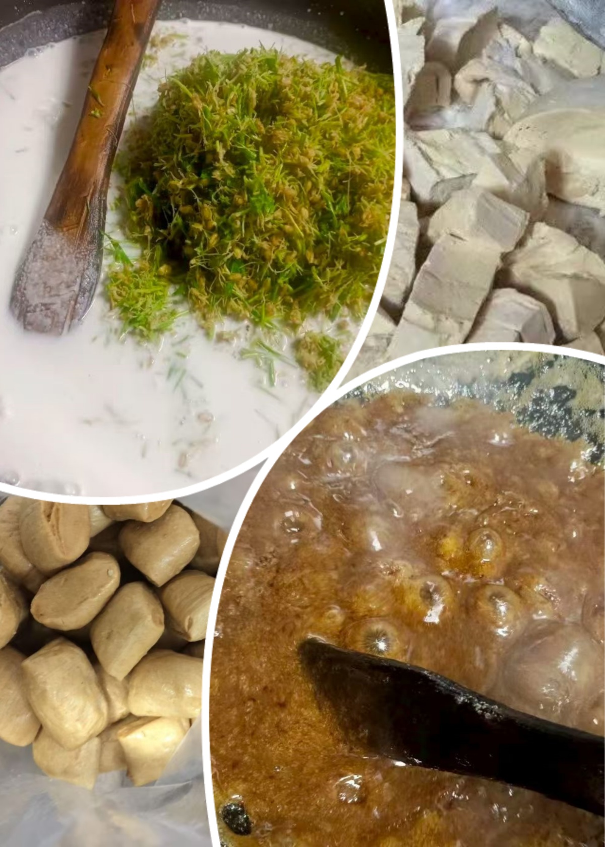 大约再过六个小时,师傅就将发酵好的浆水装入一个专用的大布袋,扎紧袋口,放在一个特制的糖槽上,用糖架将浆汁压榨出来,再倒入大锅内熬煮糖浆。刚开始时火要旺些,待锅中的浆汁沸腾后,再用勺子不停地搅拌,直至糖浆逐渐黏稠并冒出大颗粒的气泡时,火势再慢慢减小。整个熬煮过程中,火候、时间、温度都要靠经验把握,而火势的大小变换则靠添减柴火来控制,同时还要防止烧糊了锅底,这样才能做出口感好的米糖。糖匠师傅经过三个多小时的熬煮,满满一大锅糖浆最后只剩下十分之一不到的糖稀,颜色也由起初淡淡的乳白色渐渐变成琥珀一般的颜色,清澈透亮,清香扑鼻,沁人心脾,光是看着就让人垂涎欲滴。当你看着师傅熬煮每一锅糖浆,看着火苗在跳跃,看着热气在蒸腾,看着锅中的糖浆泛着一圈圈金色的涟漪,散发着甜甜的香味,不知不觉间整个人就醉在氤氲甜蜜的梦里。等师傅熄灭了灶火,就可以迫不及待地用筷子挑起长长的一缕,再卷成一团送入口中,然后慢慢咽下,那黏软香甜的感觉,瞬间就从舌尖直抵肺腑。 熬糖没有金科玉律,全凭糖匠手上的功夫和经验。出锅早了,糖不甜还容易融化,且不易保存。出锅晚了,则会又苦又硬,整体焦黄,更没有卖相。到出糖时,裹着米香的甜味溢满整个屋子,特别是糖匠师傅,更是脸上挂着满满的幸福感。
