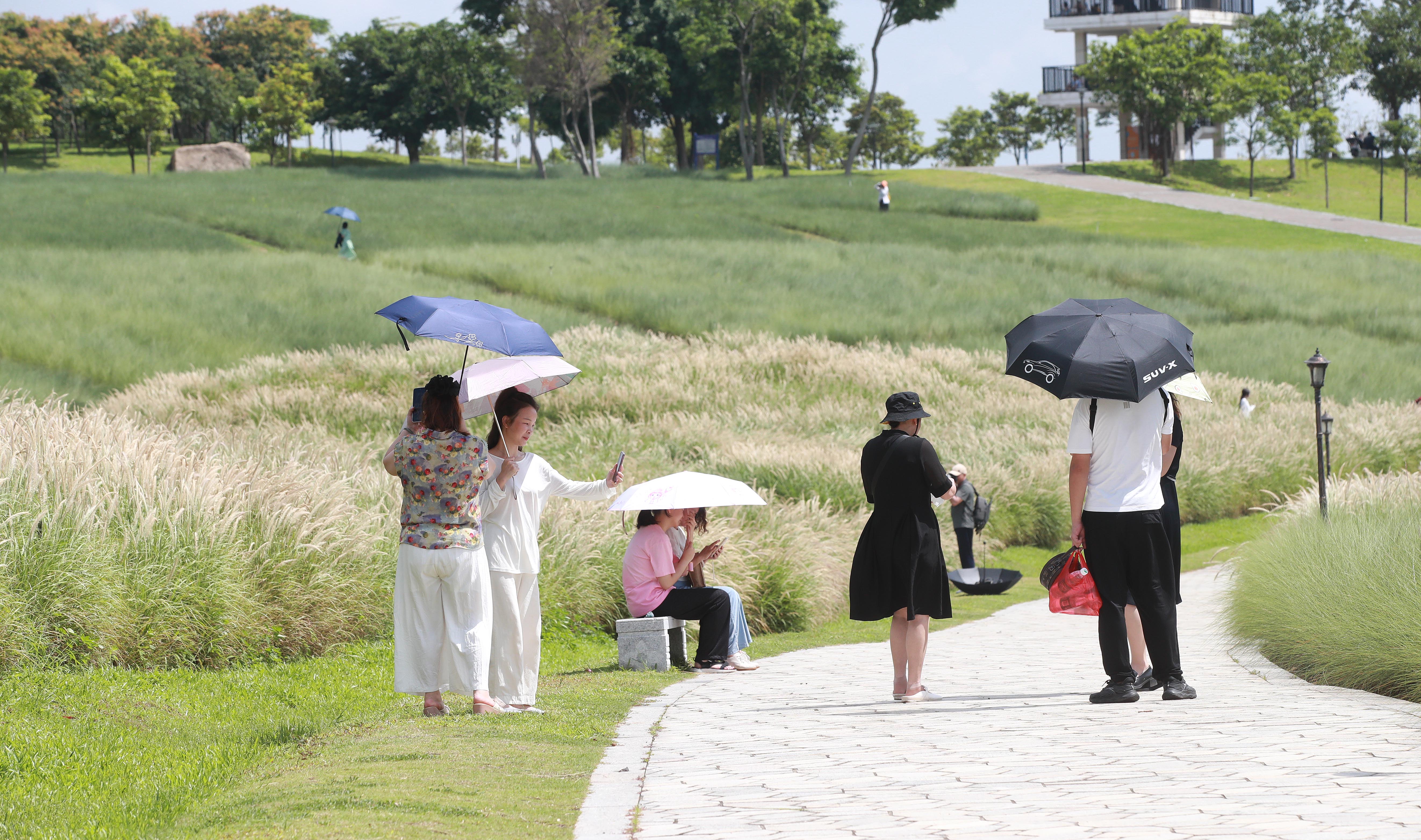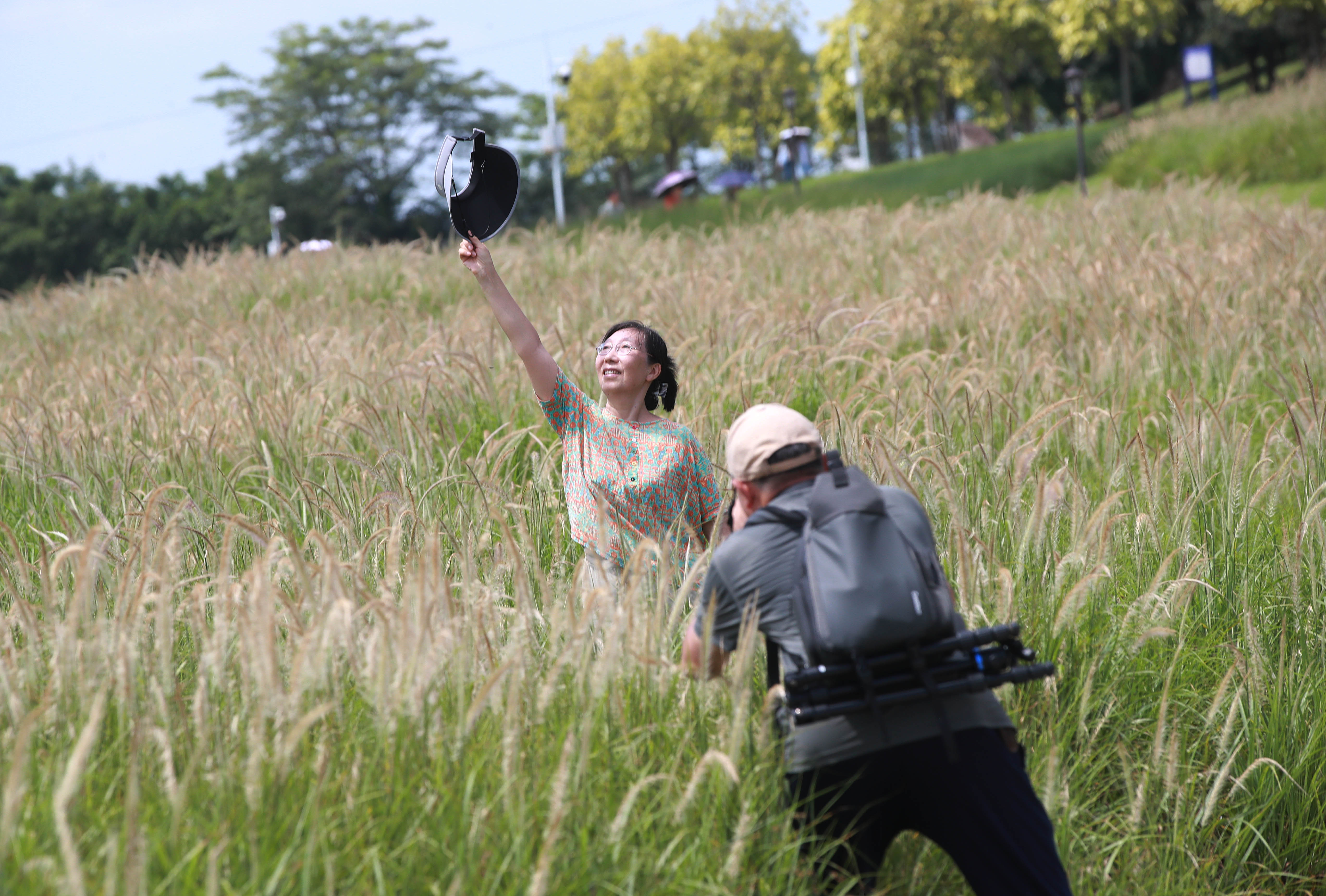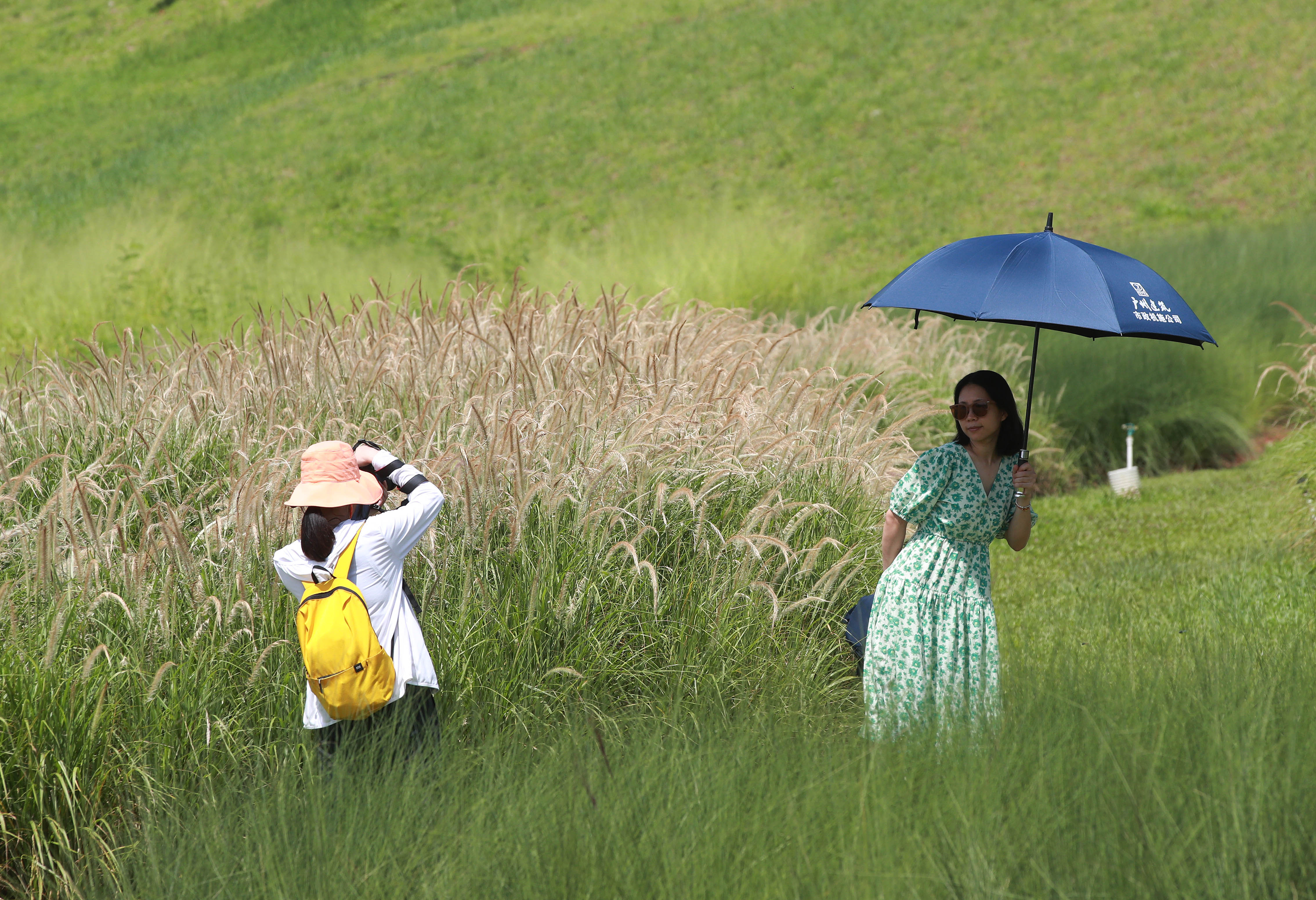 在石岩陌上花公园躬耕地一侧及拈花观景台附近,一片占地约2800平方米的区域,狗尾巴草在阳光下随着轻风曼妙蠕动,熠熠闪着金光,仿佛百亩金色的麦浪,勾起人们无限的暇想。人们穿梭其间,驻足观赏,拍照打卡,乐在其中。