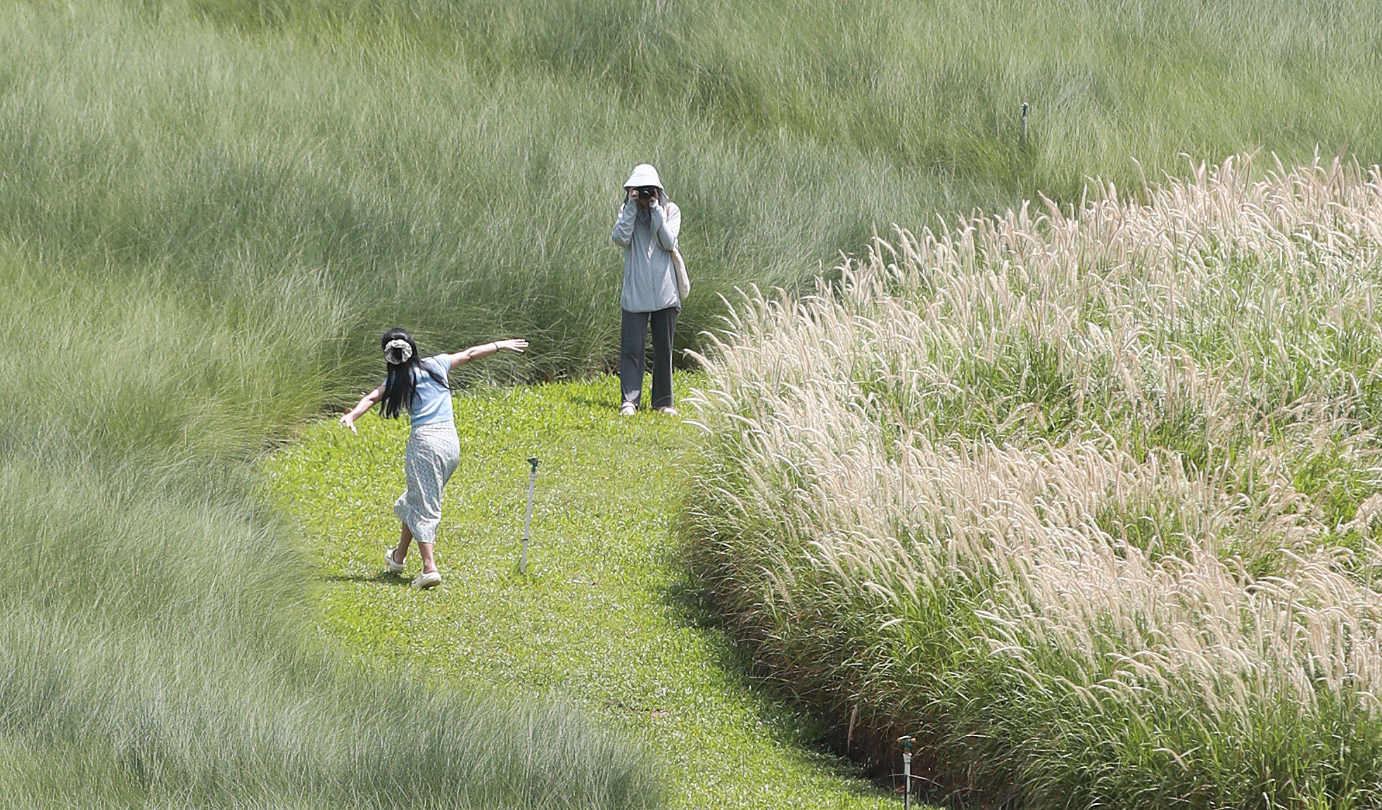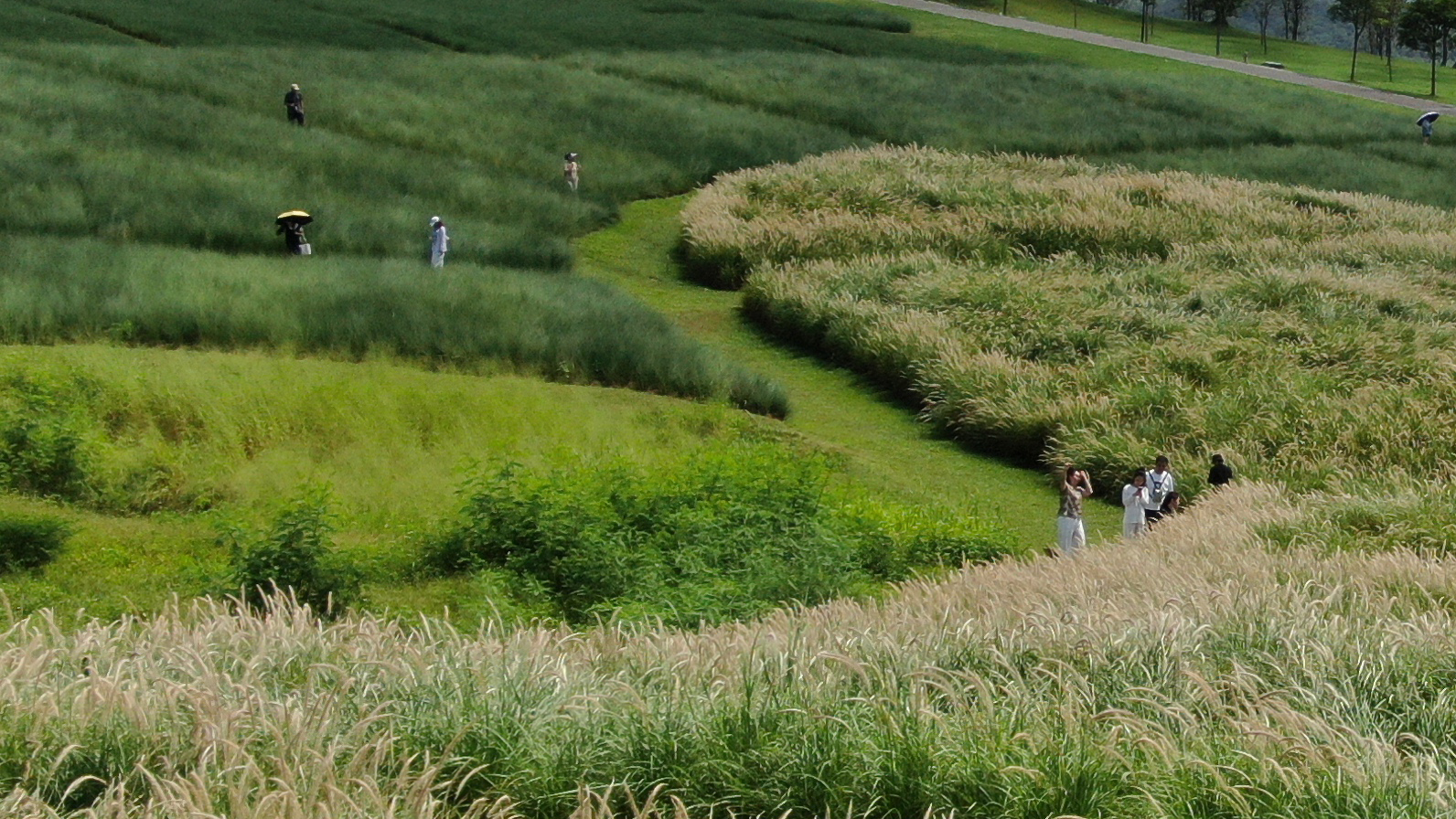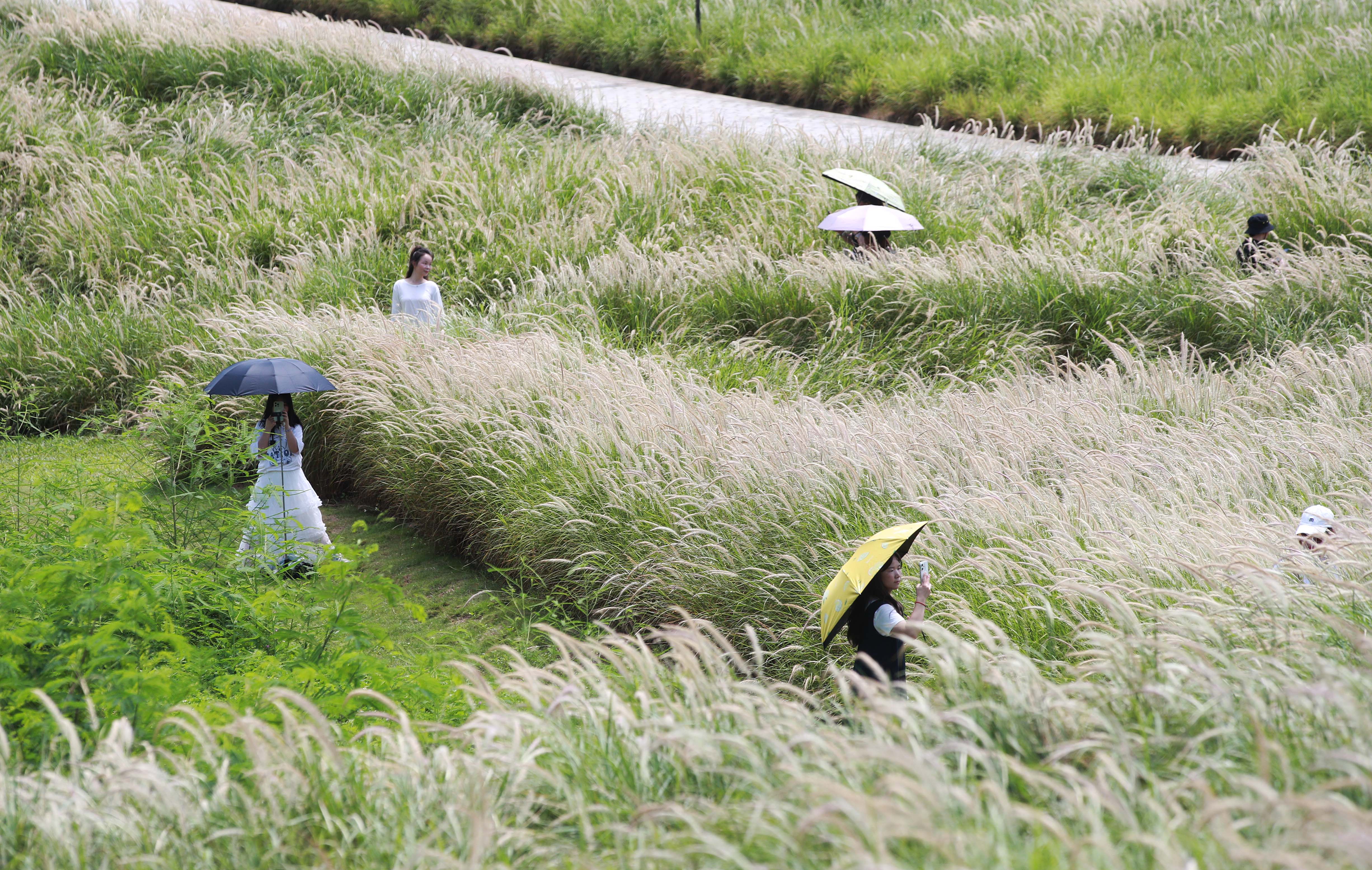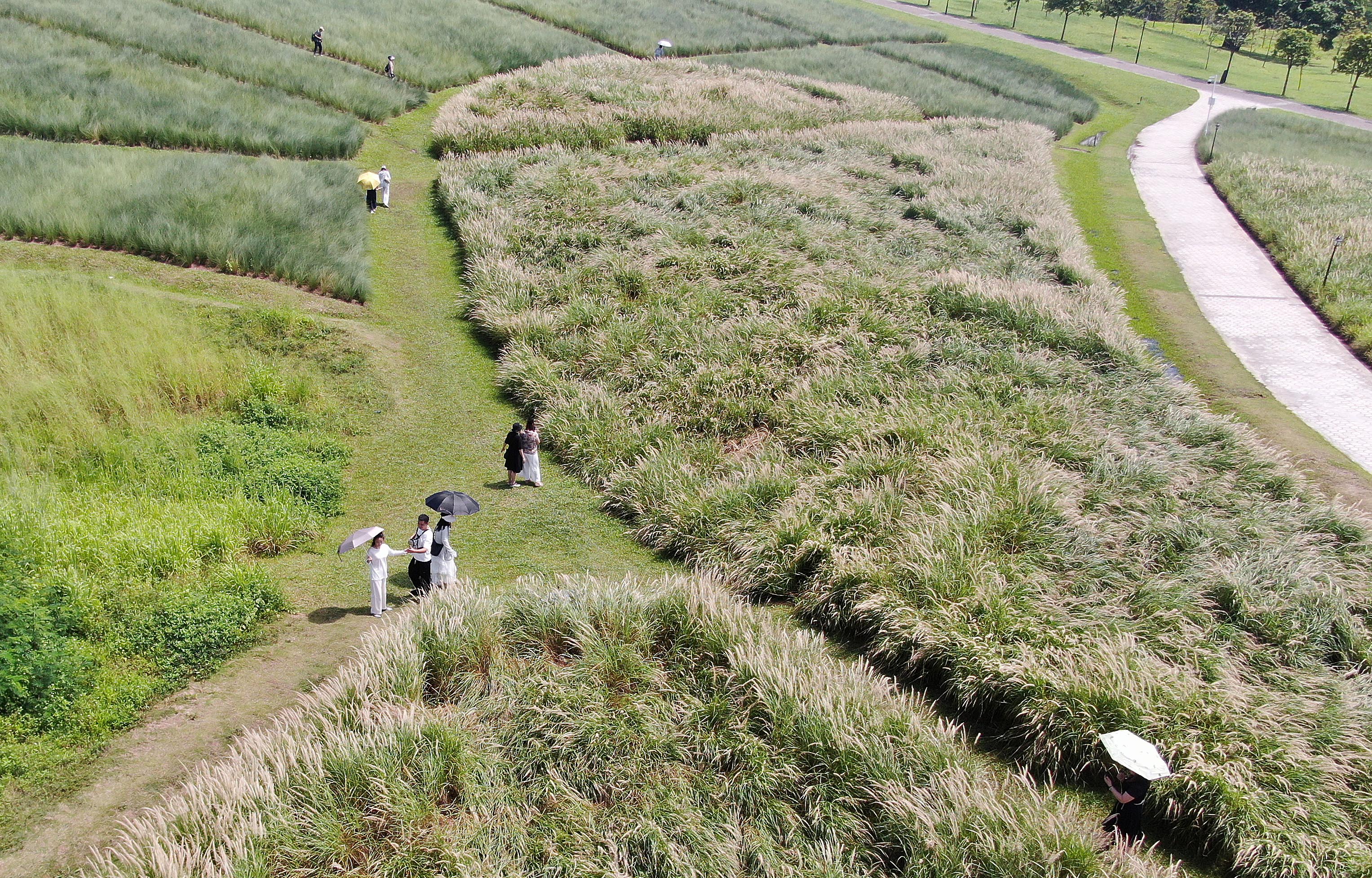 在石岩陌上花公园躬耕地一侧及拈花观景台附近,一片占地约2800平方米的区域,狗尾巴草在阳光下随着轻风曼妙蠕动,熠熠闪着金光,仿佛百亩金色的麦浪,勾起人们无限的暇想。人们穿梭其间,驻足观赏,拍照打卡,乐在其中。