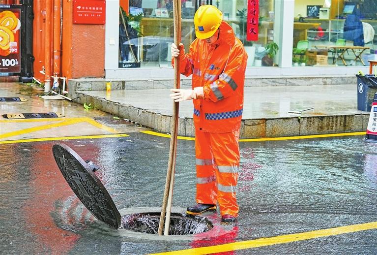 宝安排水公司工作人员对积水路段进行及时清理疏通。