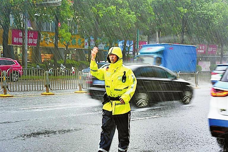 在前进路创业路口等城区繁忙路段,交警顶风冒雨坚守岗位。交警们通过手势指挥、分流引导,提醒过往车辆减速慢行,注意避让积水路段,并利用高音喇叭循环播报台风天行车安全提示,引导市民减少不必要出行。