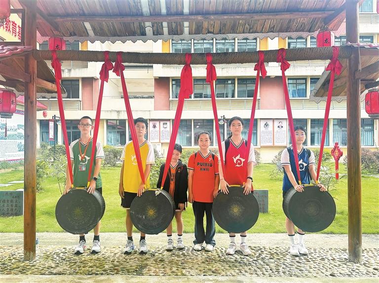 在非遗传承人的带领下,同学们一同探秘神秘古老的“壮乡蚂拐节”,聆听穿越千年的壮族古歌,学习敲击壮乡铜鼓,雄浑的鼓声在山谷间回荡,连接起古今中华民族共同的精神家园。