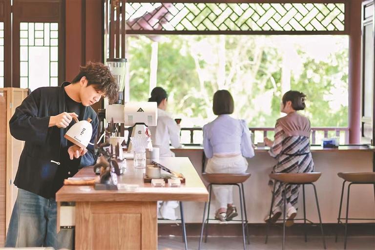 “你看这墙像画纸,光线像笔,树影像墨,中间的小池子就像一方砚台。”站在园博园粤清园的树荫下,怎生书咖啡创始人李素指着园内的景致说道。去年10月1日,正值园博园建成20周年之际,怎生书咖啡正式对外营业,成为园博园引入的首家商家。