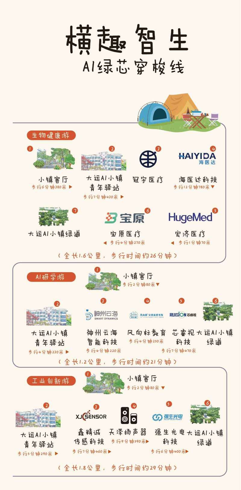 “横趣智生”路线针对不同群体设计了三条支线:医疗业务线、学生研学线、科技考察线,每条路线约1.6公里,贯穿AI产业链的“研发-应用”全场景。