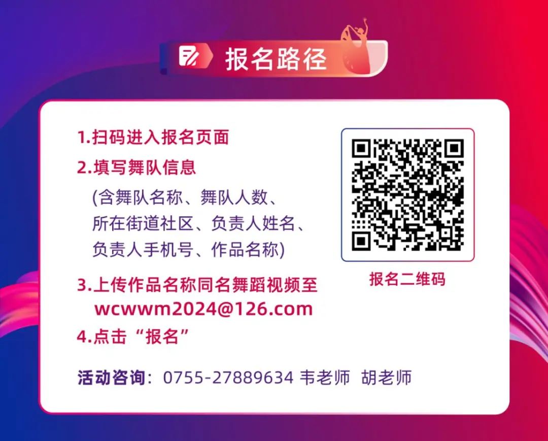 长按识别下方二维码进入官方活动平台进行报名,按要求填报舞队选手信息,舞蹈视频作品发送至邮箱(wcwwm2024@126.com),格式须为MP4,内容完整,画面清晰,无拼接、水印。