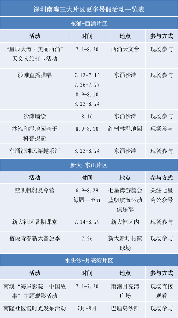 除了以上重磅活动,南澳三大片区还有天文文旅打卡、沙滩墙绘、亲子科普探索、风筝趣乐汇、海岸影院等多元精彩,暑假等你来嗨!