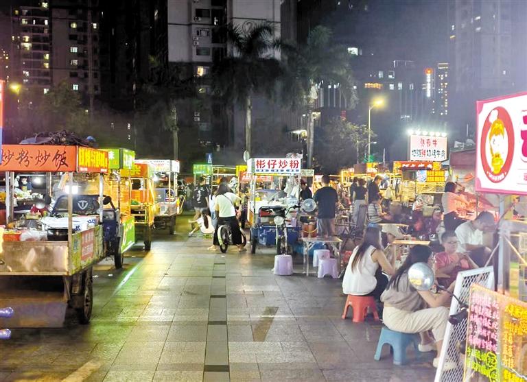 入夜,热闹的小夜市摊位整齐划一,摊主们热情叫卖,食客与顾客穿梭其间,消费热情高涨。光明农贸市场夜市,这个曾经的城市管理“老大难”,如今已成为城市经济发展的一股新动能,为周边居民的生活增添了一份烟火气。