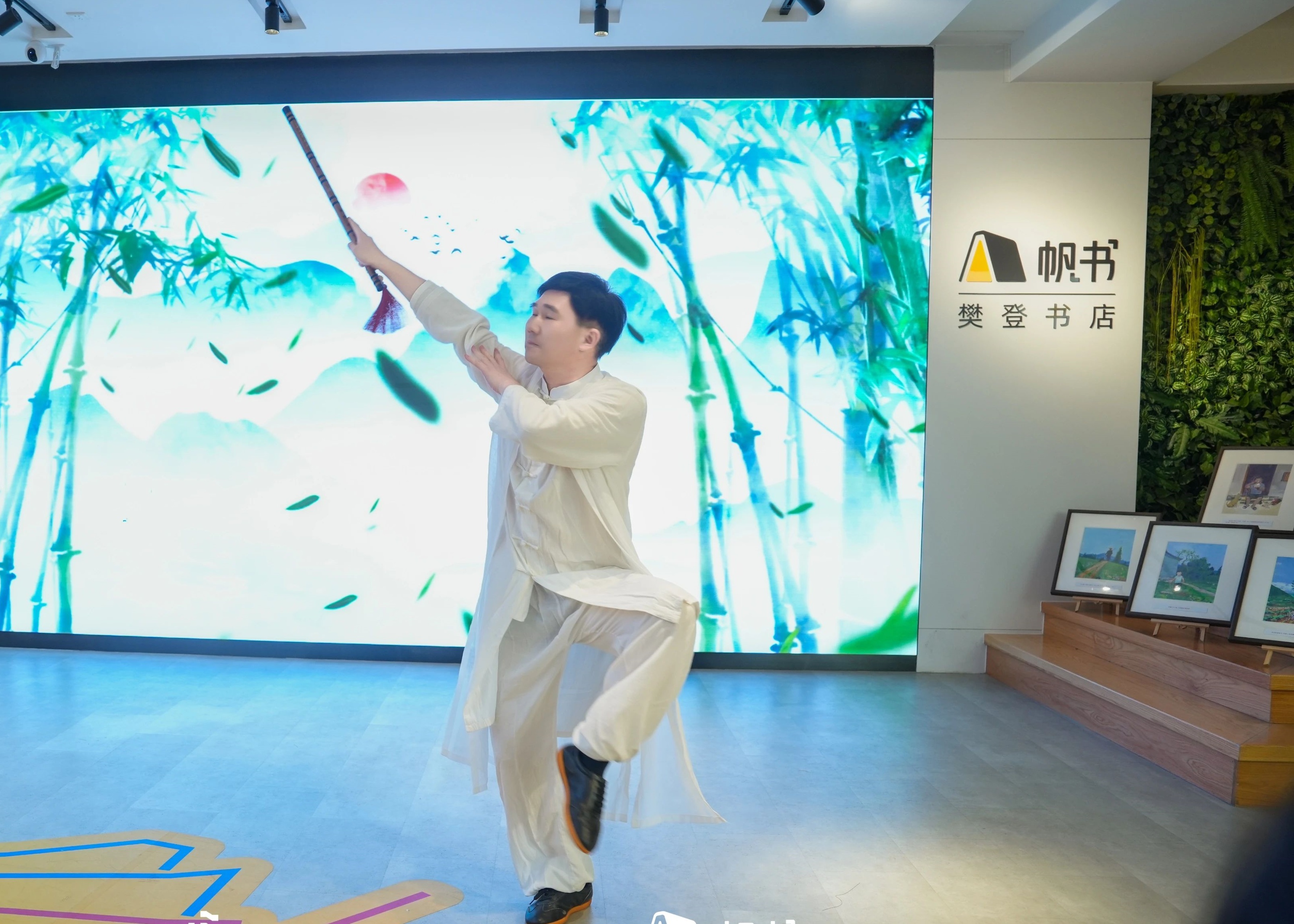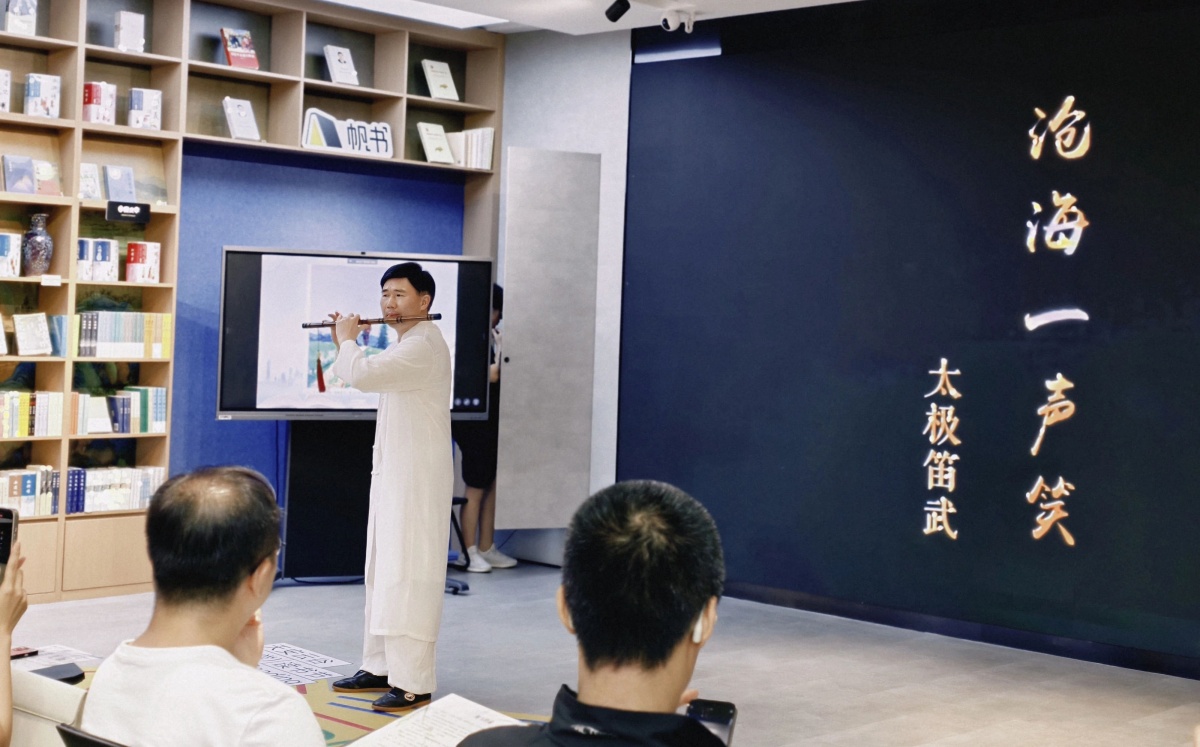 随后,王健现场表演太极笛武《沧海一声笑》瞬间点燃了气氛。王健笑谈年少时受《少林寺》《霍元甲》激发的武侠梦,那份“江湖气”并未随岁月流逝。他以笛为剑,身姿舒展,将太极的刚柔并济与笛声的悠扬豪迈完美融合。一曲《沧海一声笑》,不仅展现了作者文采之外的才情与豪情,更将现场气氛推向高潮,掌声雷动。