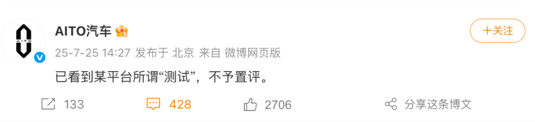 7月25日,鸿蒙智行、智界汽车、AITO汽车分别在官方微博发文称:已看到某平台所谓“测试”,不予置评。