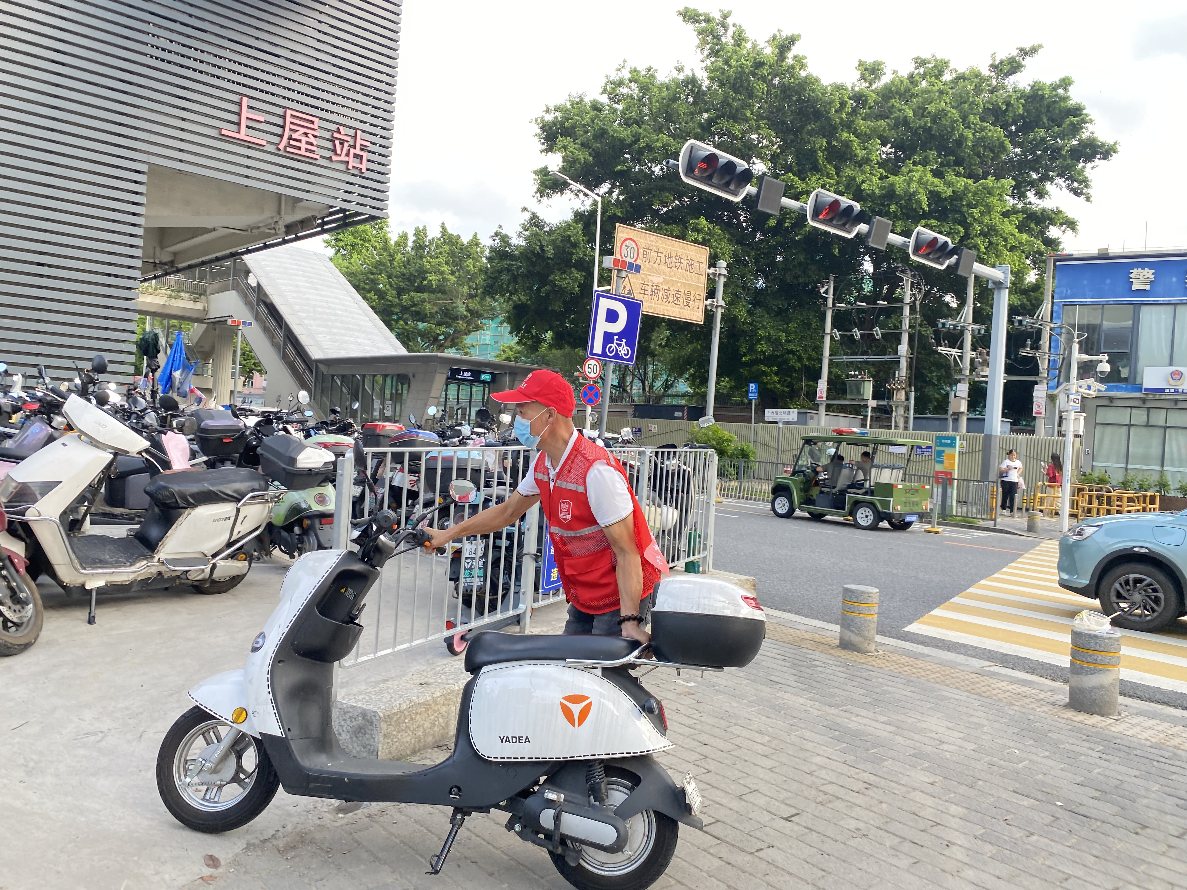 ▲在上屋地铁口,志愿者协助将电动车就近停放到指定区域。