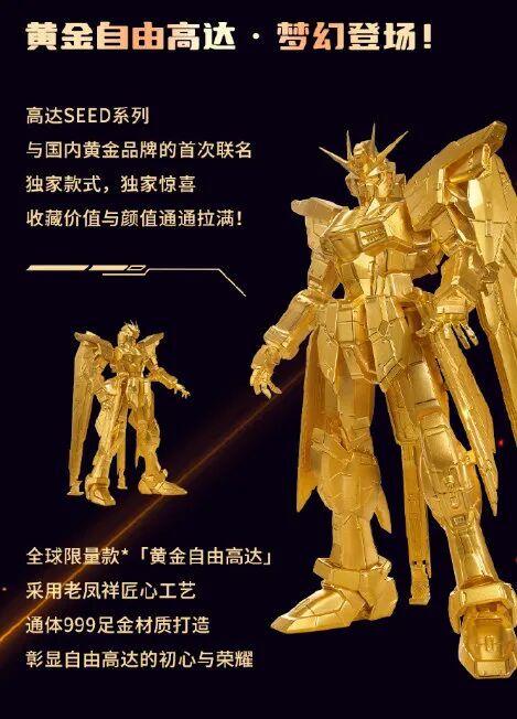 2024年,老凤祥与万代南梦宫联名发布《机动战士高达 SEED》纯黄金系列藏品;2025年老凤祥与《圣斗士星矢》携手打造金卡、转运珠、挂件以及足金立像摆件等限量产品。