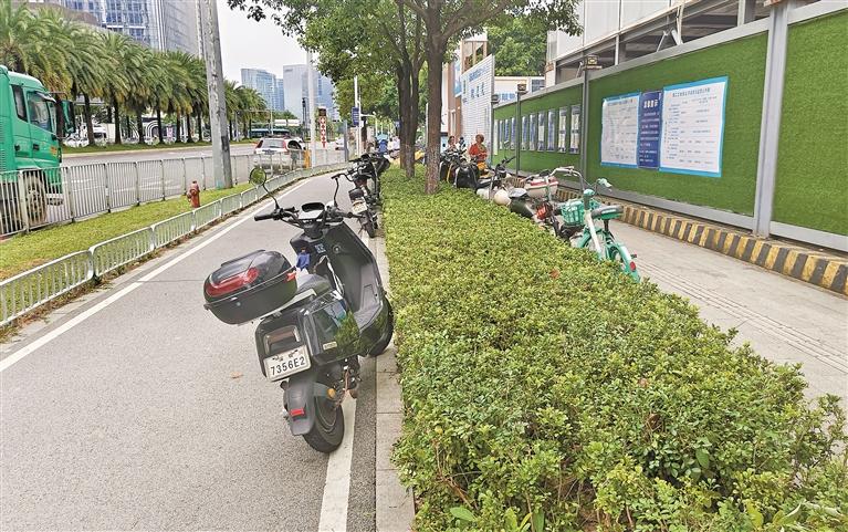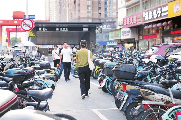 在宝安中心地铁站D出口,早高峰的人行道上,划定的非机动车停车区早已满满当当,个别车辆后轮“探头”在外,侵占着人行通道,身穿“交通劝导”马甲的工作人员正将车辆摆放整齐。百余米外,因泊位不足,几辆车“违停”在绿化带边缘。相似的场景,在流塘站B出口、新庄二路狭窄的机动车道上、罗租社区的小巷里不断上演。