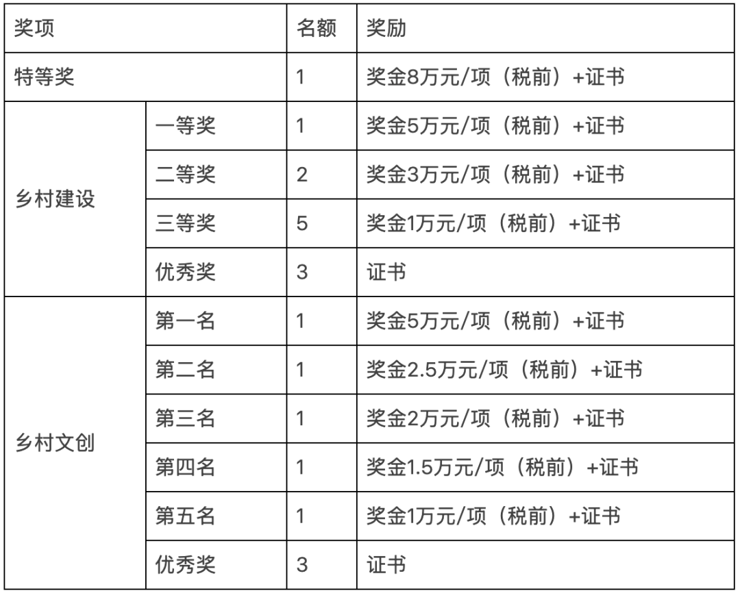 赛事设有20个奖项,其中特等奖1名、乡村建设赛道奖项共11名、乡村文创赛道奖项共8名。除获奖证书及奖金外,组委会将为优秀获奖团队安排两场招商运营推荐会,在汕头市南澳县安排颁奖与招商运营推荐会、在深圳市南山区安排展览与招商运营推荐会,洽谈招商引资项目合作事宜。同时组委会将对优秀项目实施指导跟踪、落地支持,成立共建乡村工作站,促成优秀获奖团队与对应村签订战略合作协议,对于具备落地条件的优秀项目,聘请优秀获奖团队成员为对应村“首席乡村运营师/设计师”。定期开展联席会议,实现村校企多方力量共同议事决策、精准对接需求、合力解决问题。约定团队所设计项目在一年之内,将作为村重点项目优先推动落地,活动服务单位将与对应村及团队进行同步招商,团队可优先承接后续项目设计深化及运营工作。团队将作为村内乡村建设、乡村文创项目首位考虑合作的设计团队,优先对接项目资源,共同促进乡村振兴。