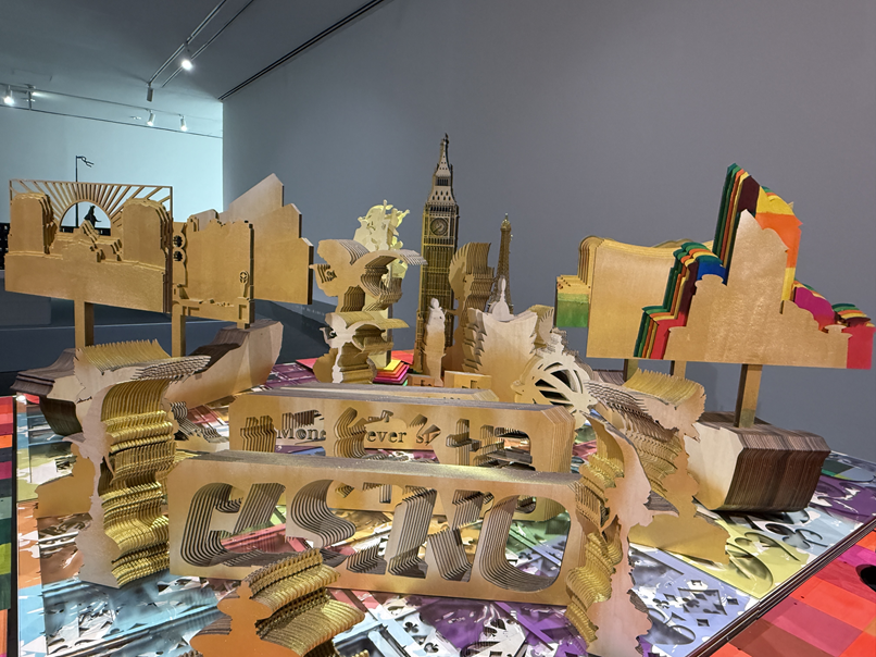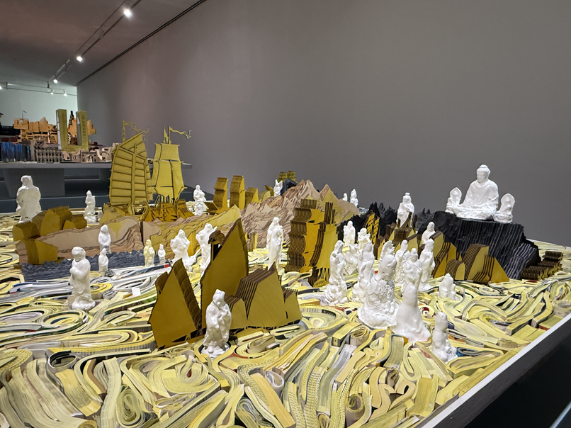 薛峰的作品《二个澳门》以四张桌拼合为微缩城市地图,并堆叠出东望洋山轮廓。作品通过“历史之门”“众神之城”“欲望之镜”“眩晕之地”四重空间,构建澳门文化双面镜像:历史建筑门廊串联四百载文化交融,见证多元信仰;而桌子模型与炫目金箔地面则直指资本欲望对城市形态的塑形。策展人冯博一评价其“以地理学手术刀剖开城市肌理”,叩问“澳门在中国的位置究竟是什么”。