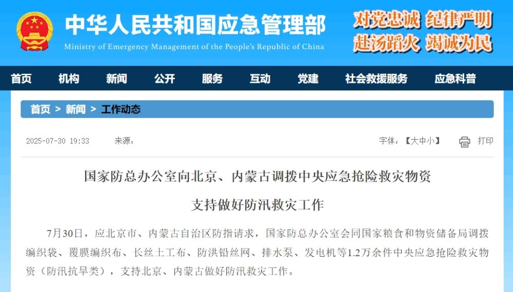 7月30日,应北京市、内蒙古自治区防指请求,国家防总办公室会同国家粮食和物资储备局调拨编织袋、覆膜编织布、长丝土工布、防洪铅丝网、排水泵、发电机等1.2万余件中央应急抢险救灾物资(防汛抗旱类),支持北京、内蒙古做好防汛救灾工作。