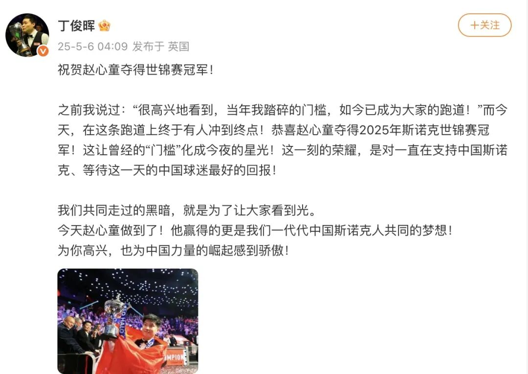 赵心童夺冠后,丁俊晖第一时间发文祝贺:“之前我说过:‘很高兴地看到,当年我踏碎的门槛,如今已成为大家的跑道!’而今天,在这条跑道上终于有人冲到终点! 恭喜赵心童夺得2025年斯诺克世锦赛冠军!”