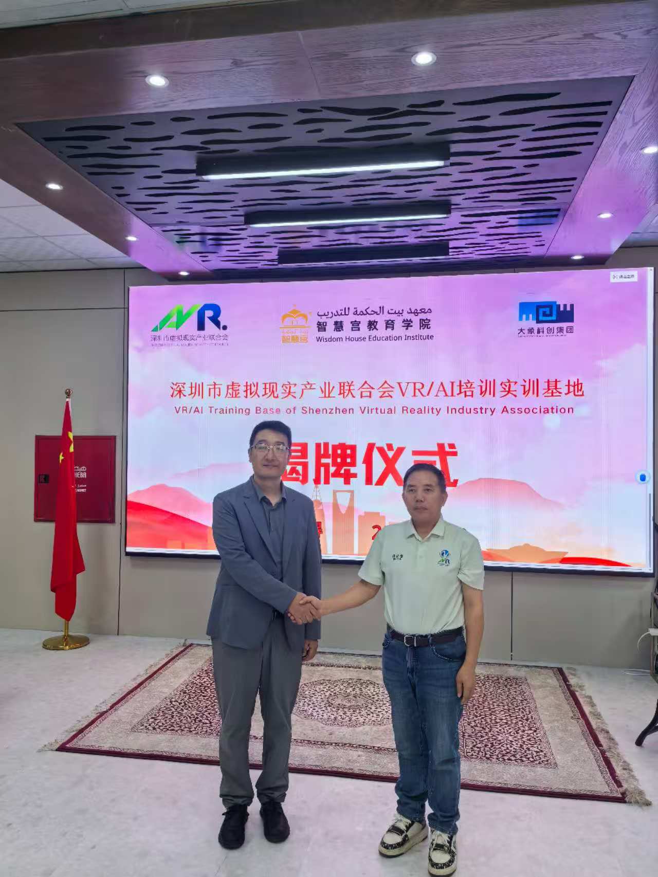 作为本次签约的重头戏,深圳市虚拟现实产业联合会与沙特塔里姆教育合作社签署战略协议,双方将共建职业技能认证体系,重点聚焦人工智能、虚拟现实等前沿领域。该项目由沙特大教育家阿卜杜拉·本·易卜拉欣·哈莱夫亲自推动,旨在支持沙特实现“培养2万名AI专家”的国家目标。作为沙特政府背景的权威教育机构,塔里姆将提供教育基础设施与国家标准认证,深圳方则负责输出技术课程与实训体系。
