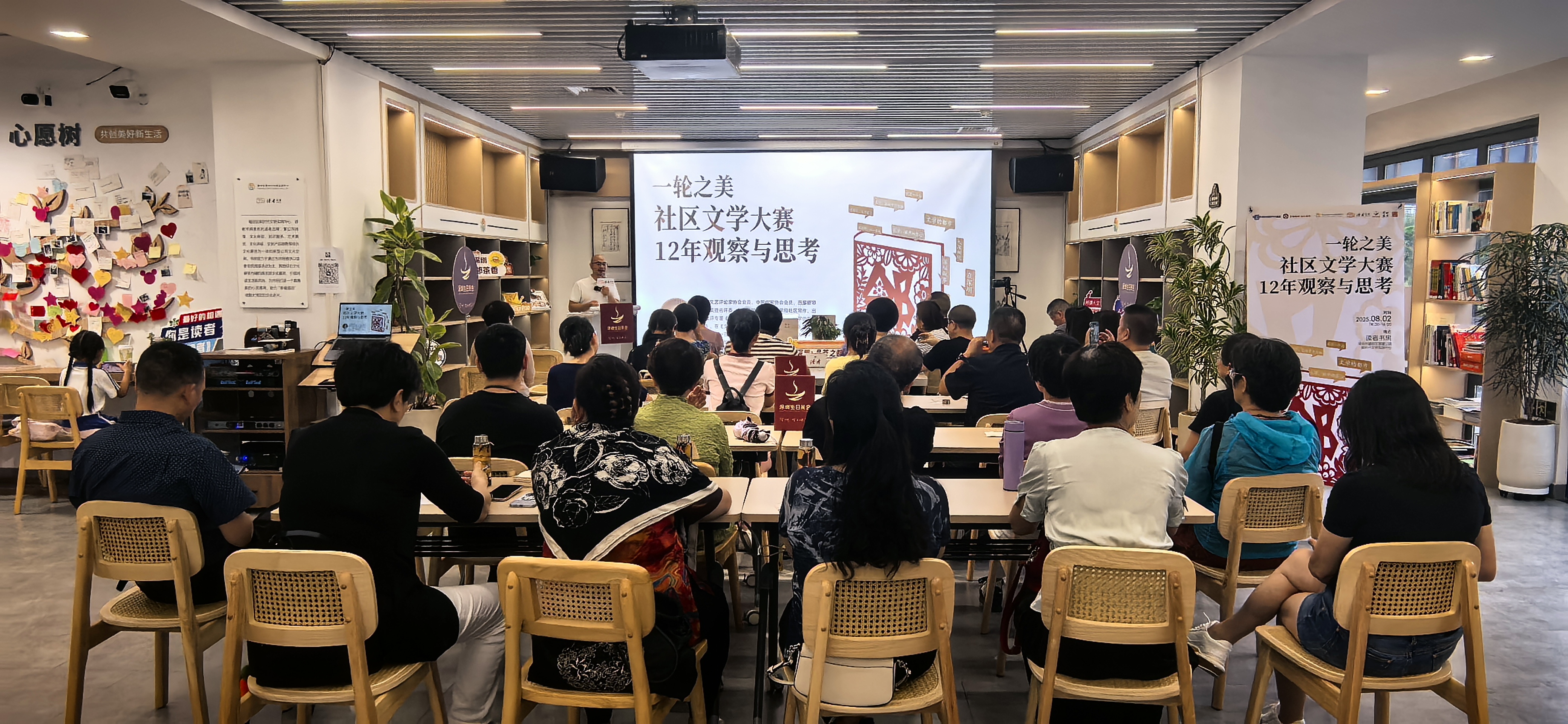 一个文学赛事如何从无到有,从小众到全民?如何用文学砌一座城?8月2日下午,“一轮之美:社区文学大赛12年观察与思考”主题活动在深圳香蜜公园读者书房举行。李晓锋、费新乾、陈卫华、李玉、段作文、梁罡烙、刘桃德、王学君、雨夕、胡笑兰、柳琴、清扬、李曼、王海波等30余位睦邻文学奖提名评委、优秀作者参加活动。活动获得深圳市宣传文化基金、福田区宣传文化体育事业发展专项资金的大力扶持。