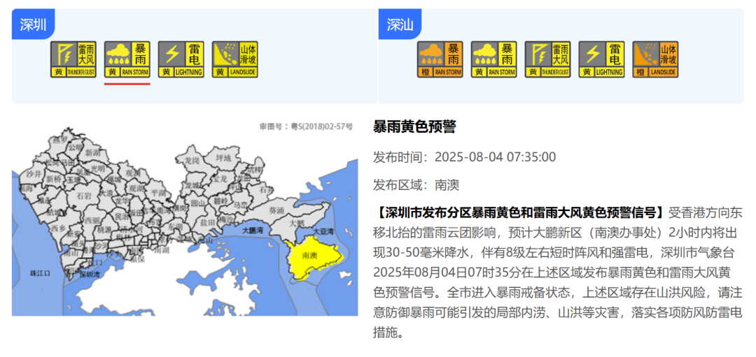 受香港方向东移北抬的雷雨云团影响,预计大鹏新区(南澳办事处)2小时内将出现30-50毫米降水,伴有8级左右短时阵风和强雷电,深圳市气象台2025年08月04日07时35分在上述区域发布暴雨黄色和雷雨大风黄色预警信号。全市进入暴雨戒备状态,上述区域存在山洪风险,请注意防御暴雨可能引发的局部内涝、山洪等灾害,落实各项防风防雷电措施。