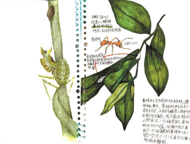他翻开随身携带的笔记本,页面上有日期、地点、记录人,精细的线条与画面,工整的注记,边上还有一行字迹:“黄猄蚁成虫会用自己幼虫吐出的丝线缝合叶片筑巢。”