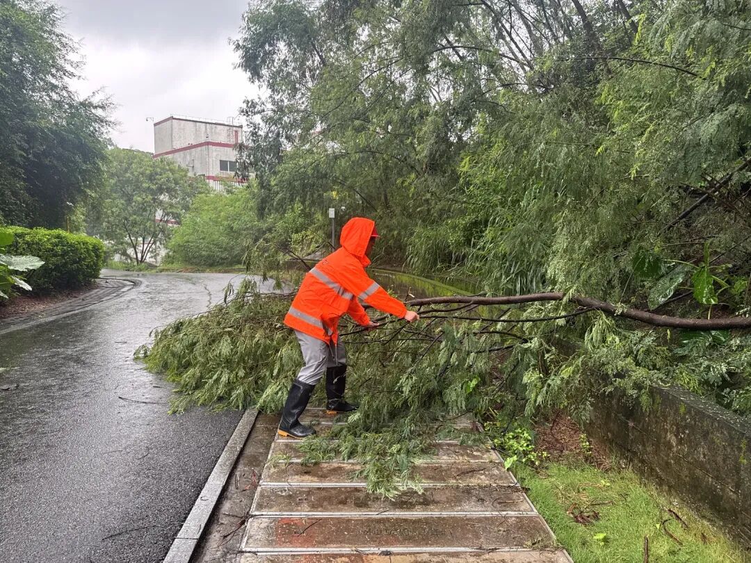 光明管理局道路养护工作人员清理、扶正周家大道路面倒伏树木。