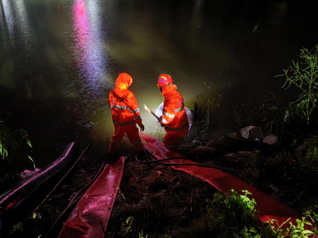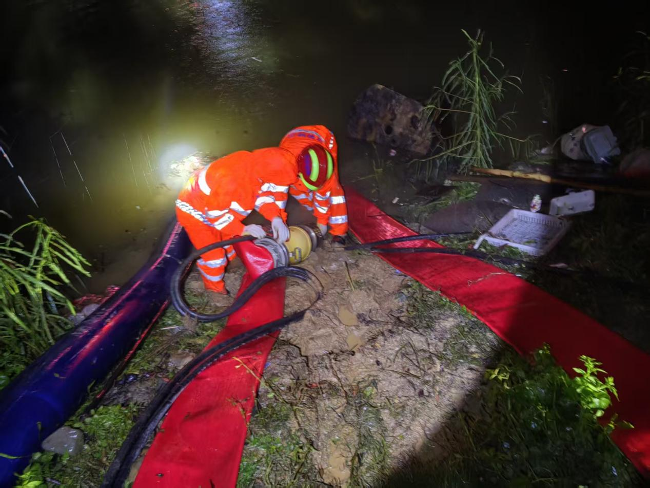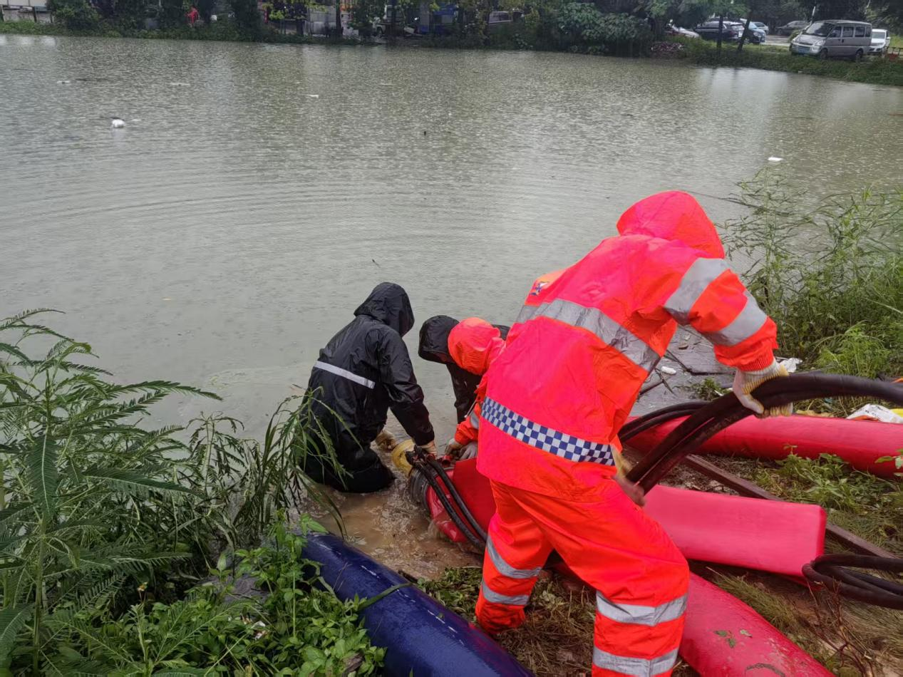 8月4日0时30分,宝安排水救援队抵达指定抽排点小漠镇元宵围。当时全镇暴雨红色预警高悬,局部遭遇特大暴雨,小漠镇平均雨量达171毫米。雨势凶猛,元宵围村边的大鱼塘水位急剧上涨,积水倒灌蔓延至村边路面。救援队抵达后迅速勘察地形,制定抽排方案,队员分组铺设排水管道并架设两台流量达500m³/h的水泵,紧急抽排鱼塘积水排入周边河道。
