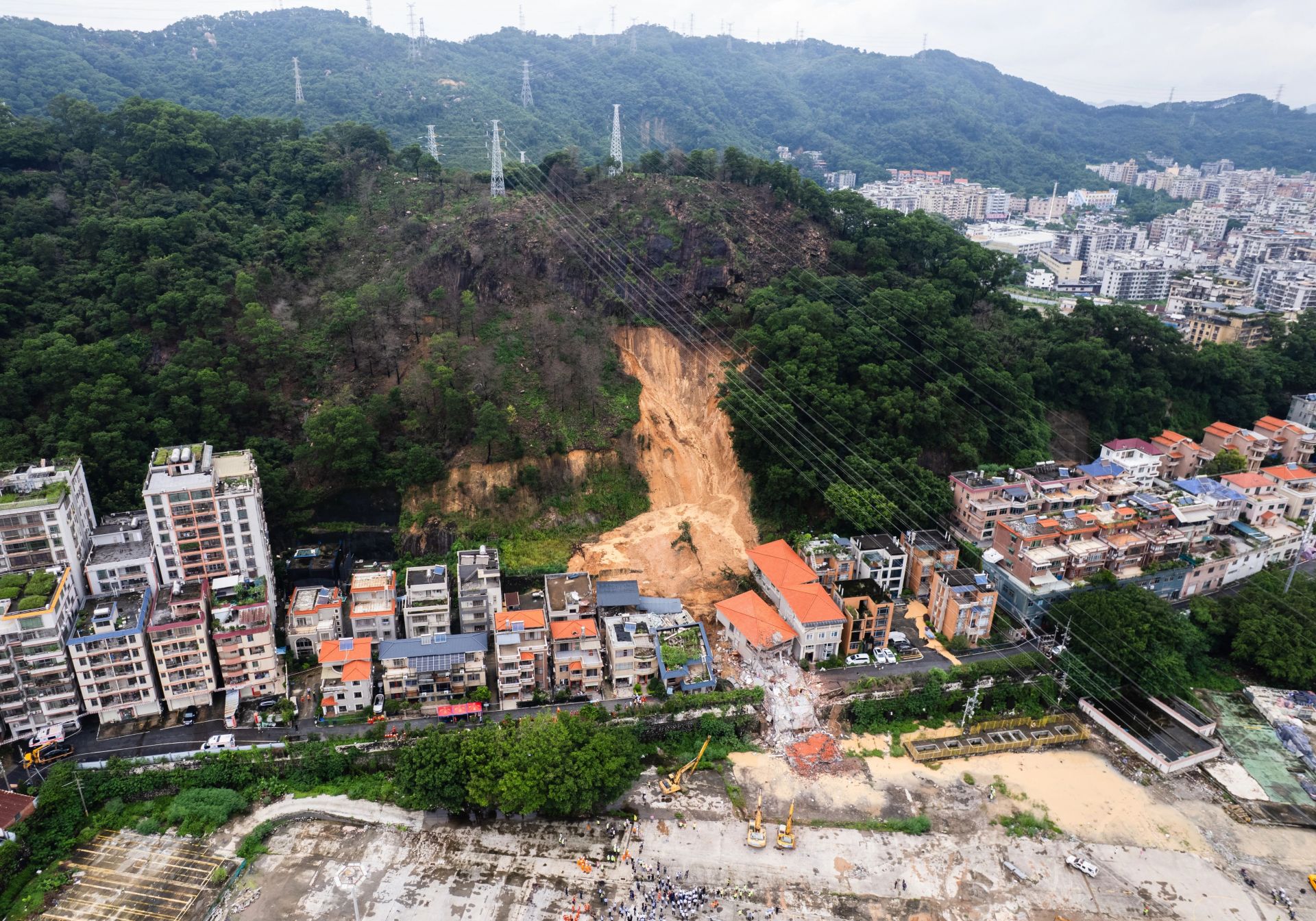 8月7日中午,广州市白云区山体滑坡救援现场,救援人员开始对受损房屋实施破除作业。