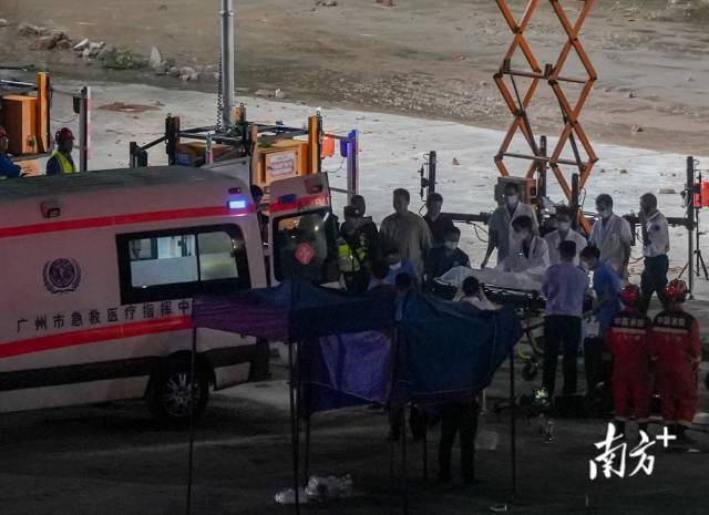 8月7日19时50分左右,南方+记者在现场看到,救援人员用担架从现场抬出又一名被困人员,并迅速送上救护车。此时距离事发已经过了约36小时。