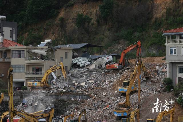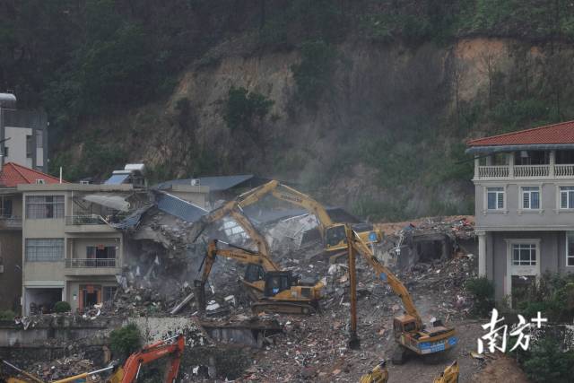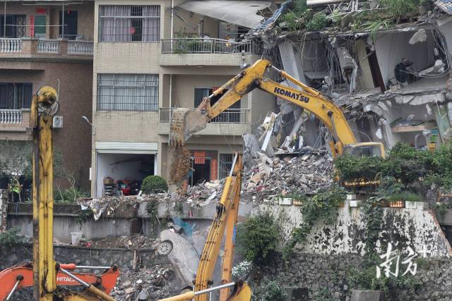 8月7日下午5时许,广州山体滑坡现场被破除房屋的清理工作正在进行。南方+记者在现场看到,此前倾斜的两栋楼房已经不复存在。据悉,破除工作完成后,救援人员将开展深度搜救工作。