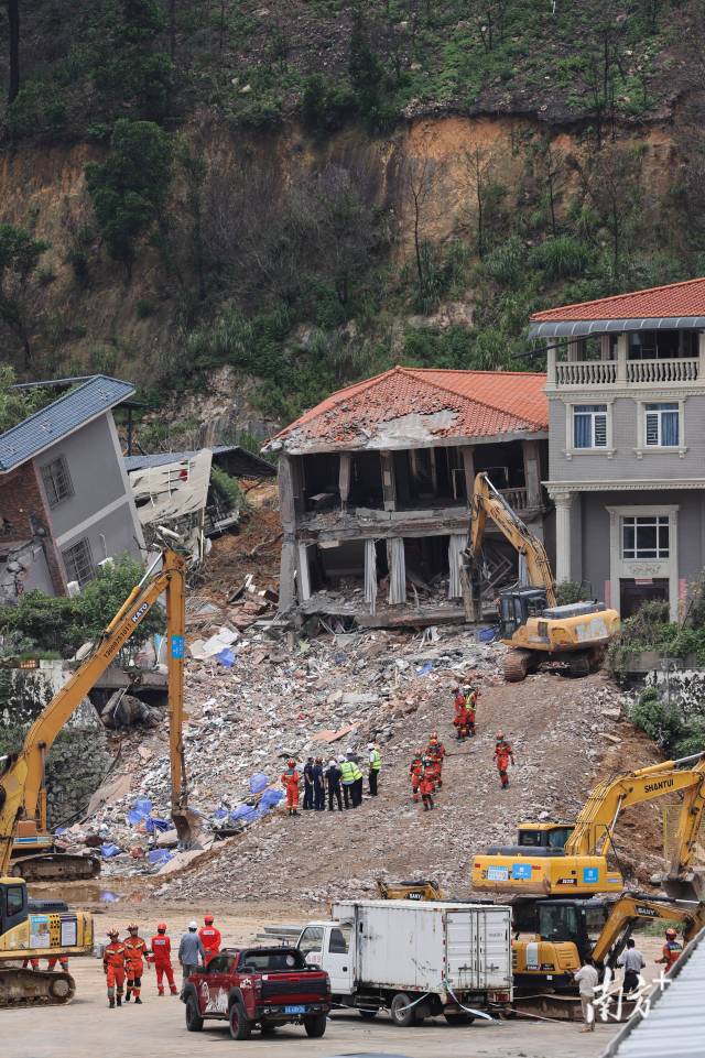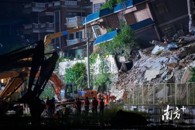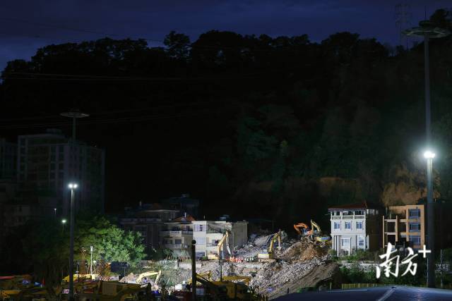 8月6日21时,南方+记者在现场看到,救援力量仍在进行救援,现场有挖掘机进行作业。