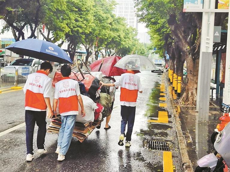 8月4日下午,一名收废品的老人在雨中艰难地拉着手推车,因雨势较大,车子侧翻倒地。西乡街道河东社区党群服务中心的社工与3名青少年志愿者看到后迅速上前,帮助老人将废品重新整理上车,并将手推车拉至废品收购站,此举赢得老人的连连感谢。
