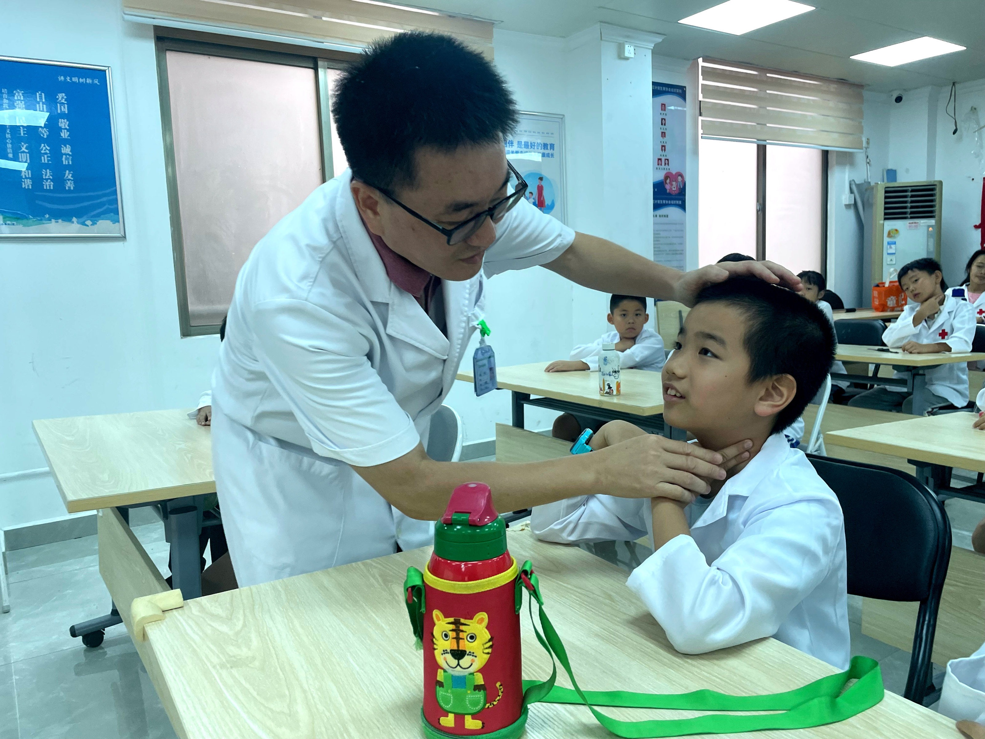 另两个板块带领孩子们开展趣味实践。“小小医生体验”环节,孩子们穿上特制迷你“白大褂”,走进模拟医疗场景。通过学习辨识常用医疗用品和突发意外伤害处理方式等活动,近距离感受医者仁心,在角色扮演中消除就医恐惧。“急救小卫士课堂”环节,孩子们在专业医护人员指导下学习辨认日常意外伤害场景,并通过模型实操掌握简单伤口处理、突然昏迷意外情况急救等关键技能,成为守护自己与家人生命安全的“第一响应人”。