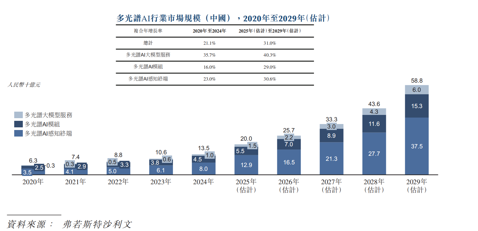 该机构预计,受技术进步推动,多光谱AI作为交叉赛道,2029年市场规模将达588亿元,复合年增长率达31%。而多光谱AI关联的全球端侧AI、感知智能、泛安全市场规模将分别达到1.22万亿元、5891 亿元、1.13 万亿元。