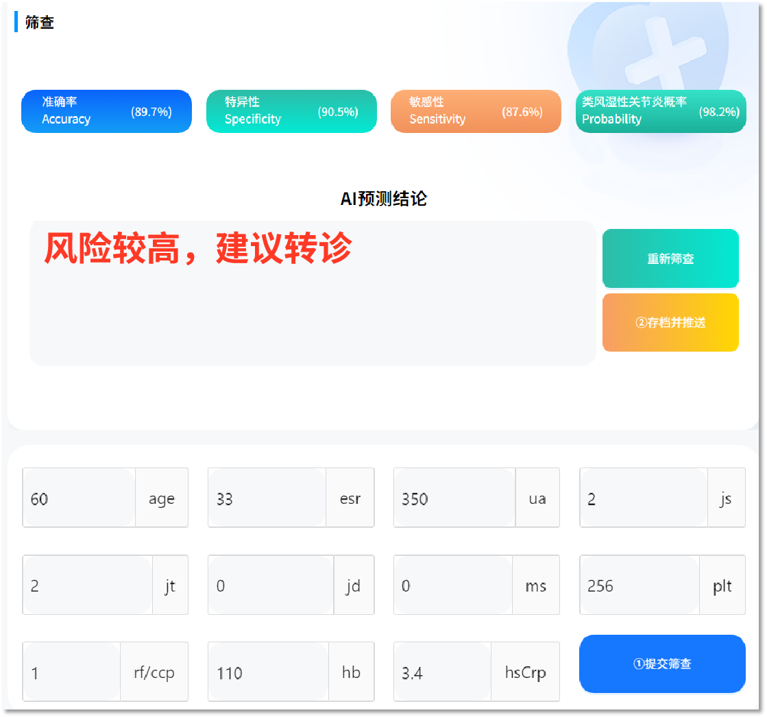 陈俊安排陈叔去抽血,做了血沉、尿酸等基础指标的检验后,拿出了一个“秘密武器”——AI-RA早筛模型,在模型输入了陈叔的血沉、尿酸、类风湿因子、C反应蛋白、关节肿胀数、关节压痛数、关节畸形数等血象检验和临床症状的11个指标数据后,几秒钟后,这款“AI搭子”为陈叔“算”出了结果:风险较高,建议转诊。