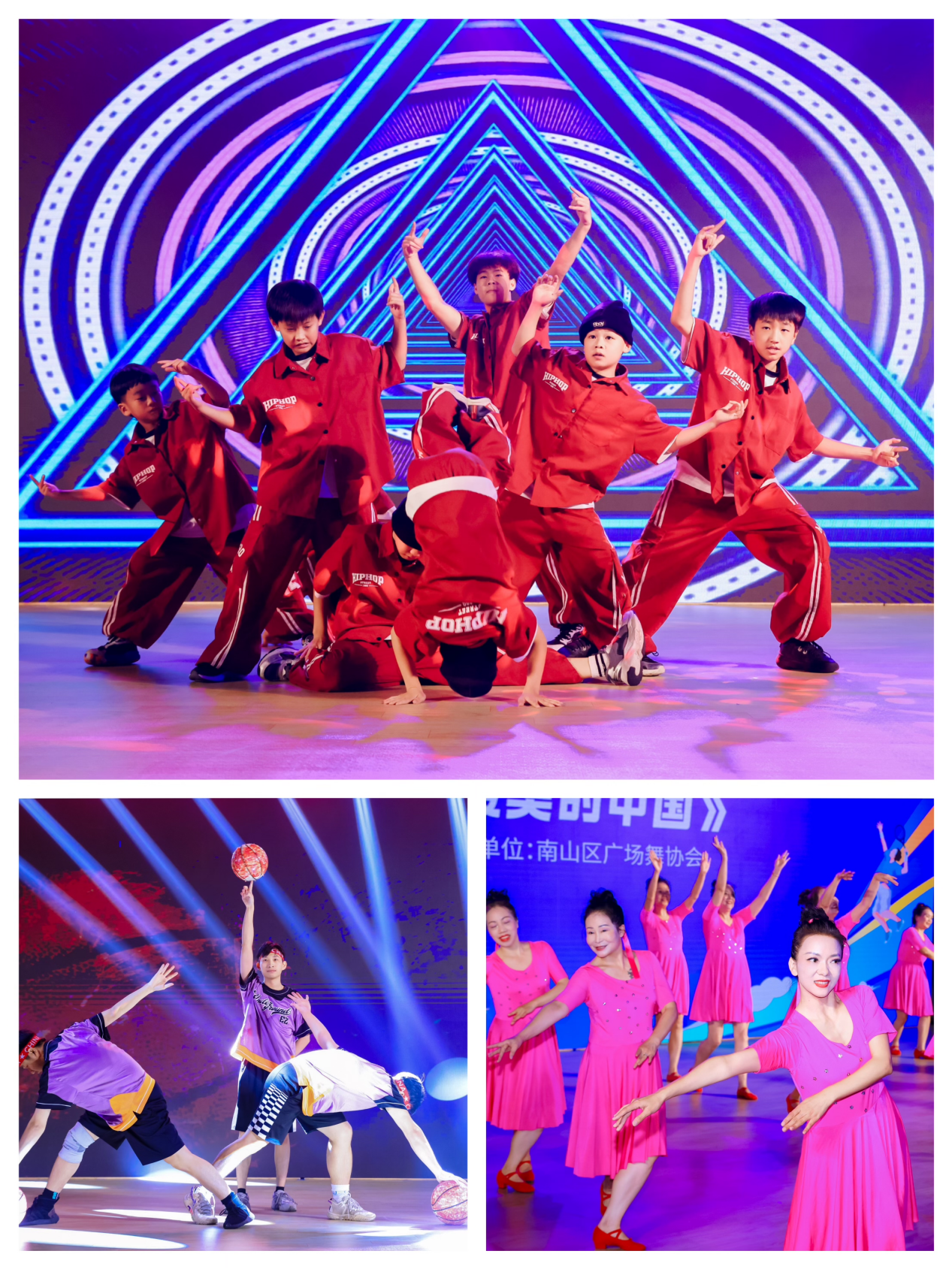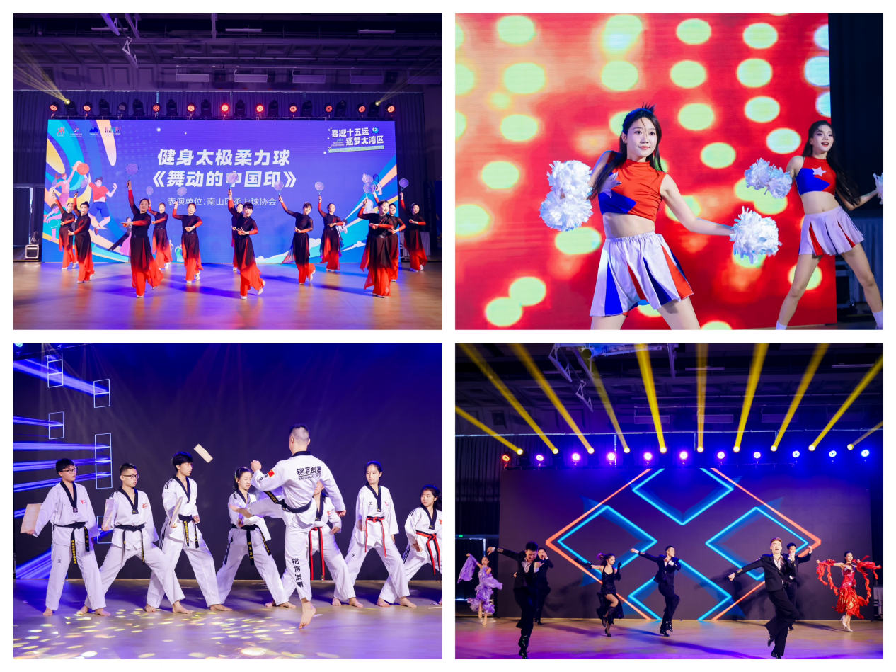 南山区体育总会的青春啦啦队以动感跳跃点燃全场气氛,充分彰显青春风采;南山区体育舞蹈协会的队员们裙摆飞扬,用灵动舞姿绽放青春光彩。挥洒的汗水、飘动的裙摆,皆是代代人青春奋斗的象征。在这样专业且富有激情的舞蹈表演引领下,深圳市铭将发景跆拳道队的选手以凌厉腿法展现竞技魅力;嘻哈部落街舞团炫酷炸场动作,将当下流行的音乐元素融入表演中,生动诠释潮流文化;南山区体育总会的花式篮球运动员通过空中接力、胯下运球,重新诠释篮球运动的独特观赏性;南山区柔力球协会与南山区广场舞协会分别带来舒缓有力的柔力球表演和欢快激昂的广场舞表演,展现了不同年龄层市民对健康生活的追求。