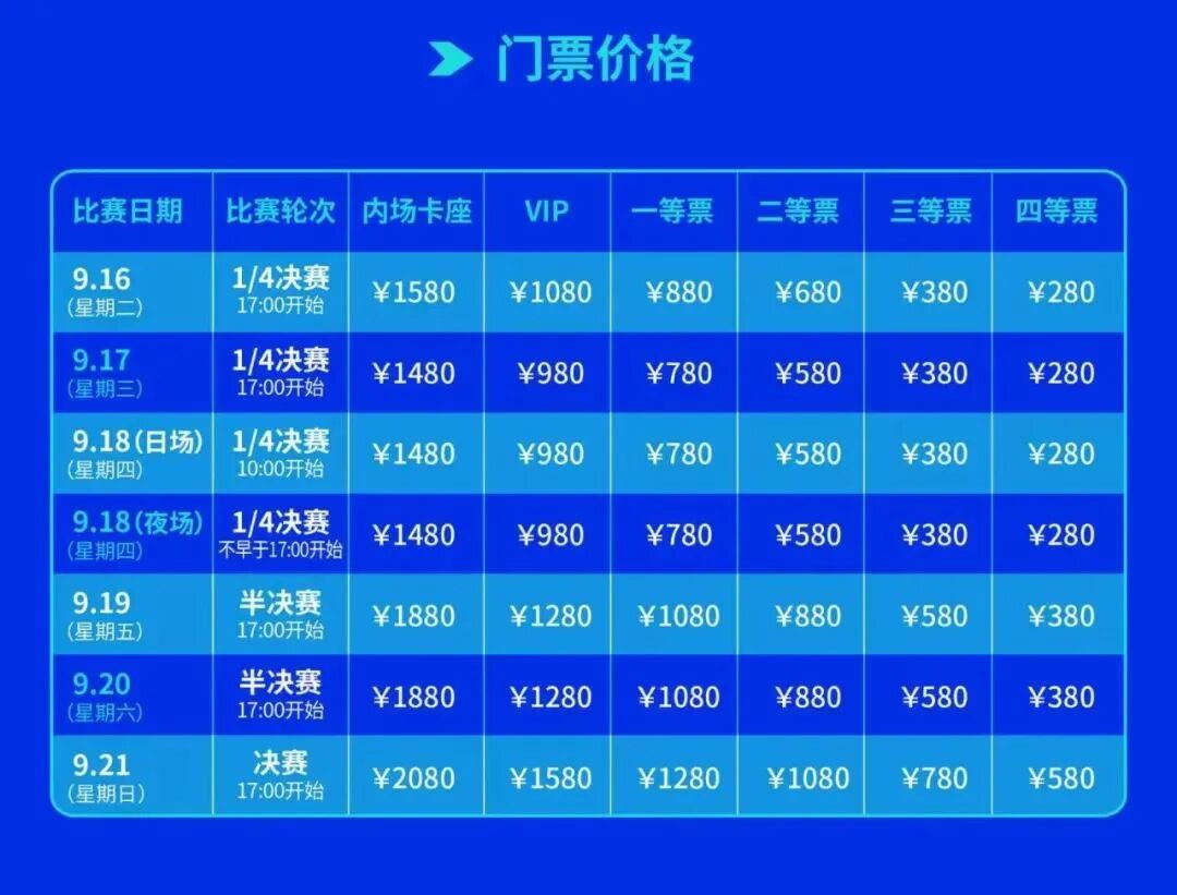 其中8月8日20:00至8月15日20:00为第一轮售票(不支持选座),可购买四分之一决赛(9月16日-18日)门票,一等票、二等票、三等票可享限时8折优惠。8月15日20:00起正式售票,届时可购买所有场次门票,并开放选座功能。因涉及赛事直播、体育展示,开赛前可能会有部分座位进行释放,敬请关注。