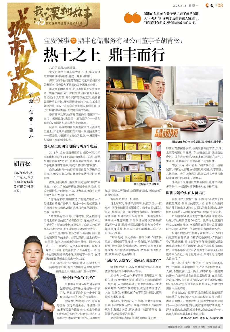 风雨中,年轻的胡青松却奔走在滚烫或淅沥的街道上,汗水从未能阻挡他一次次抬起手臂,叩响一扇扇陌生的门——那是他扎根深圳物流业的起点,一场用汗水与诚信书写的创业长征。