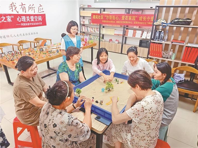 近日,塘尾社区在社区服务中心开展妇女成长小组活动。以沙盘为载体,为10余名妇女搭建探索家庭关系的互动平台。