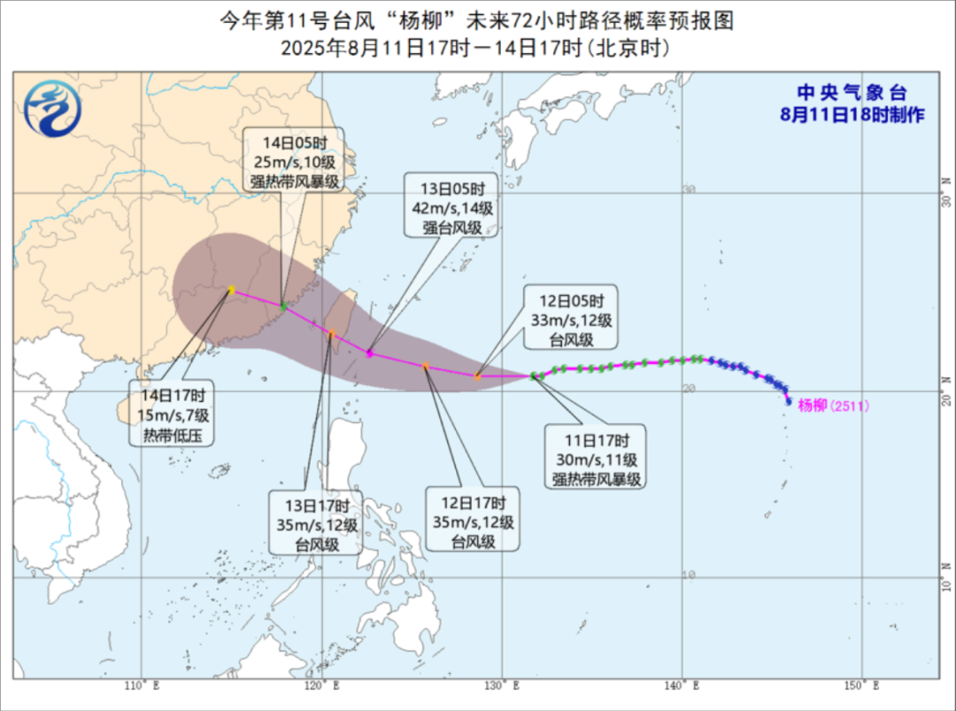 8月11日14时,台风中心位于台湾台东偏东方向大约1160公里的西北太平洋洋面上,中心附近最大风力11级(30米/秒)。