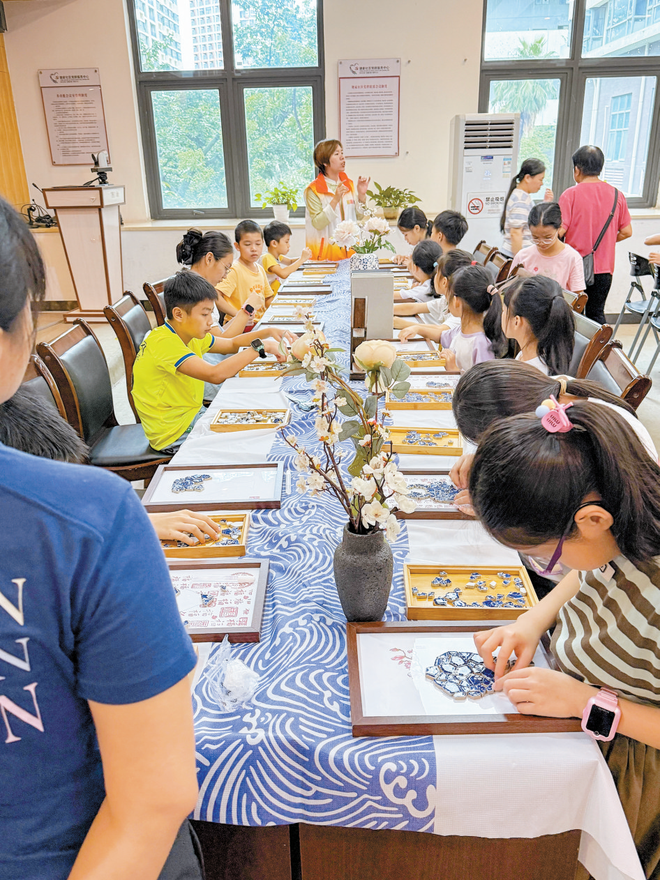 在工作人员指导下,居民化身“艺术家”,充分发挥想象力与创造力,运用形态各异的景德镇瓷片进行艺术创作。工作人员适时分享贴画技巧和创意构思方法。大家或专注构思,或细致拼贴,或互相交流创意。参加活动的黄同学高兴地说:“最近社区活动特别多,我们的暑假过得既充实又开心。没想到不起眼的碎瓷片,也能变成这么美的艺术品!”