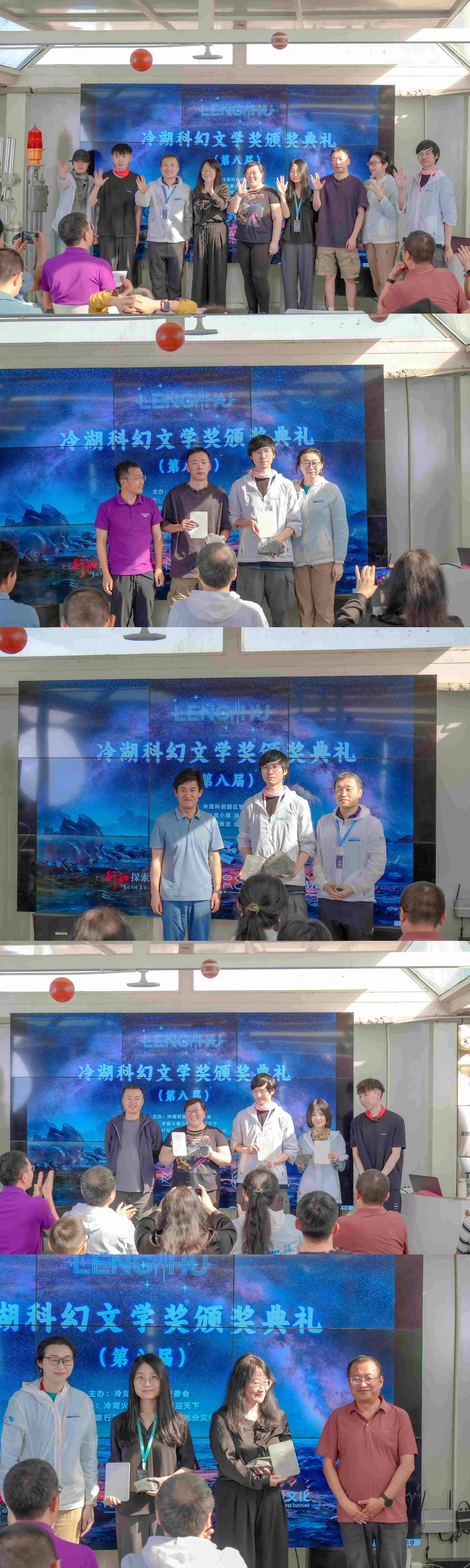 冷湖奖评委会主席吴岩,金豆豆等评委分别宣读颁奖词,并与海西州人大常委会副主任、冷湖科技创新产业园区管委会常务副主任田才让,副主任李炜、赵毅,杭州研极微电子有限公司董事长杨作兴一同为获奖作者颁奖。