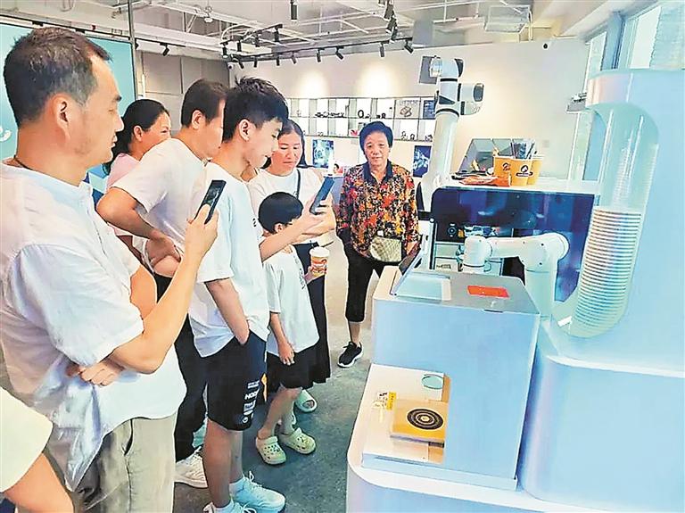 开放日当天,现场人潮涌动,盛况空前。市民朋友争相体验“会做咖啡和冰淇淋的机器人”带来的奇妙感受。在安诺AI机器人圣代冰淇淋亭前,市民朋友对着屏幕选口味。“我要吃草莓酱+奥利奥碎碎的经典搭配!”点完单,机器人精准下料、旋转塑形、加果酱、加小料,30秒就递出一杯冒着冷气的圣代。“夏天就该这样,不用等、够新鲜,AI把冰淇淋做成了‘即时快乐’。”不少市民对AI技术与生活场景的完美融合赞叹不已。