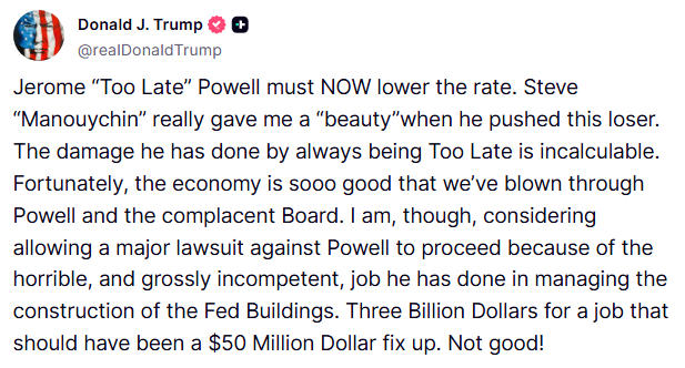特朗普在社交媒体上发文,要求鲍威尔立即降息,并指责他“总是行动迟缓”。