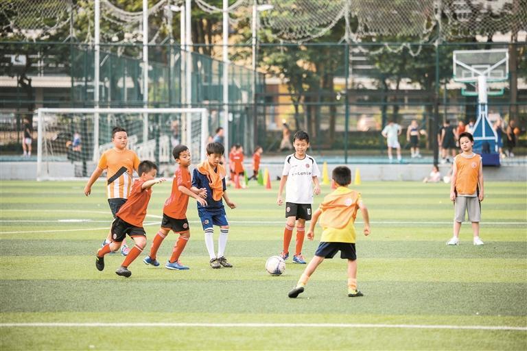 ▲少年们在观湖中心公园的足球场享受运动的快乐。